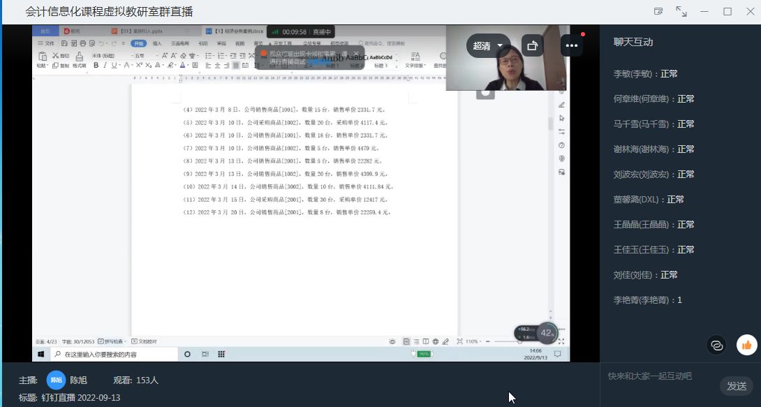 2022年9月13日下午,由教育部会计信息化课程虚拟教研室、重庆市成渝数智会计虚拟教研室、重庆市会计信息化教学名师工作室联合主办的智能会计教学工作坊(第十四期)在钉钉APP线上直播顺利举行。我院邀请到重庆理工大学陈旭教授为同学们讲授《会计业务数据分析》课程。9428cn太阳集团古天乐王世杰老师和2022级会计专硕全体学生参加了此次教学工作坊。