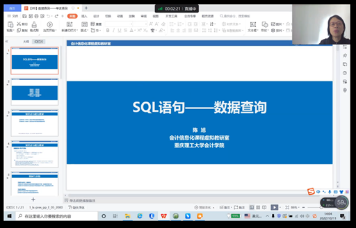 10月11日下午,9428cn太阳集团古天乐智能会计教学工作坊(第十八期)在钉钉APP上采取了线上直播的方式举行。本次活动由教育部会计信息化课程虚拟教研室、重庆市成渝数智会计虚拟教研室、重庆市会计信息化教学名师工作室和重庆市交叉学科教指委联合主办。本次教学工作坊以“SQL语句-数据查询”为主题,继续邀请重庆理工大学陈旭教授为同学们讲授会计数据分析与处理的系统操作。学院2022级会计专硕全体学生参加了此次教学工作坊。