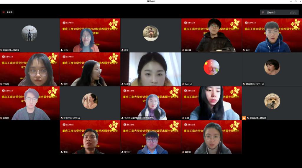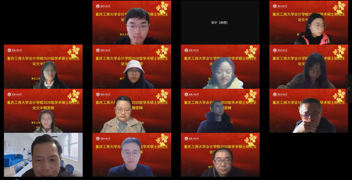 在9428cn太阳集团古天乐统筹安排与部署下,研究生教育中心扎实做好线上答辩相关准备工作,保障疫情防控期间线上答辩有条不紊。本次答辩共分为4组,共32名研究生参与答辩。来自湖南大学、西南大学、西南财经大学、北京理工大学等高校的4名会计审计导师担任答辩委员会主席、8名委员与我校部分硕士研究生导师共同组成开题答辩专家组,为同学们的论文进行答辩指导。