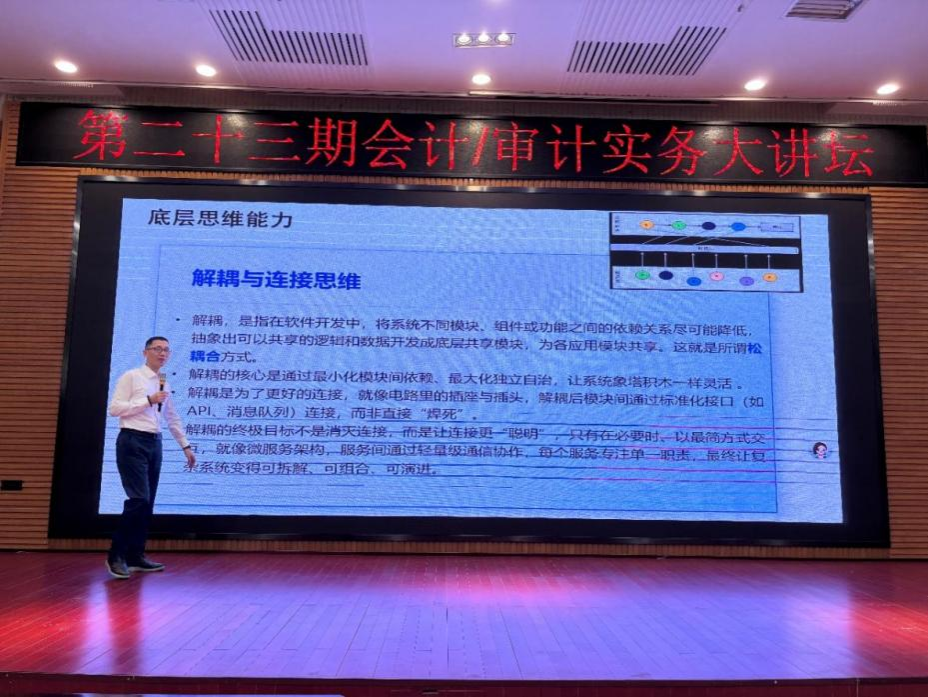 针对大数据时代会计系统的构建逻辑,魏美钟董事长重点解读了“解耦与连接思维”。他解释道,“解耦”并非割裂,而是在软件开发中降低系统模块、组件间的依赖关系,抽象出可共享的逻辑与数据,形成底层共享模块,实现“松耦合”。他以微服务架构为例,说明这种思维能让每个服务专注单一职责,通过轻量级通信实现协作,最终使复杂的会计系统变得可拆解、可组合、可演进,为师生理解现代会计信息系统搭建提供了清晰框架。