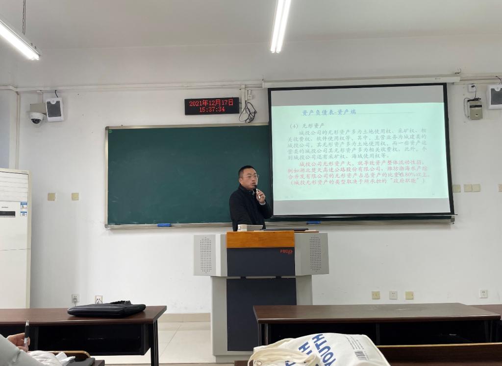 首先,王经理从次贷危机产生的原因出发,为同学们介绍了城投的起源及发展历程。随后,他结合国家政策和战略以及市场因素为同学们详细介绍了如何站在资金方的角度评价城投报表,提出“虔诚式闭眼”和“逃避式闭眼”两种看报表方式。王经理通过大量实务案例,为同学们讲解如何从利润表、资产负债表和现金流量表中,看出城投的盈利能力、资产变现能力和再融资能力,强调核心是报表科目背后蕴含的公司行为与宏观政策的关系。王经理为同学们介绍了城投公司标准化债权融资产品时,回顾了平台公司融资监管的相关政策,通过对债券产品进行分类和比较,对债券市场进行了概述,对多种平台公司债券工具进行了介绍,最后,对平台融资政策的顶层设计思路进行了总结,他认为,平台融资政策的设计是一个循序渐进、实现城投公司规范化的过程。
