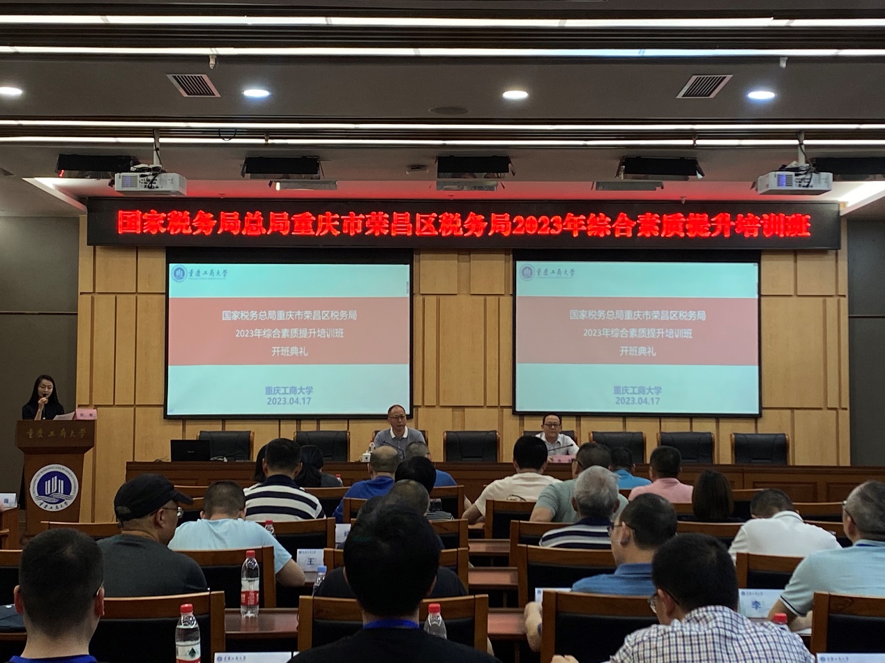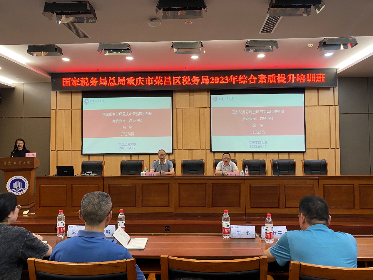 2023年4月17日下午,国家税务总局重庆市荣昌区税务局2023年综合素质提升培训班开班仪式在我校图书馆会议中心一会议室举行。重庆工商大学9428cn太阳集团古天乐党委书记邓德敏,国家税务总局重庆市荣昌区税务局党委委员、总经济师 余多及全体学员出席开班仪式。