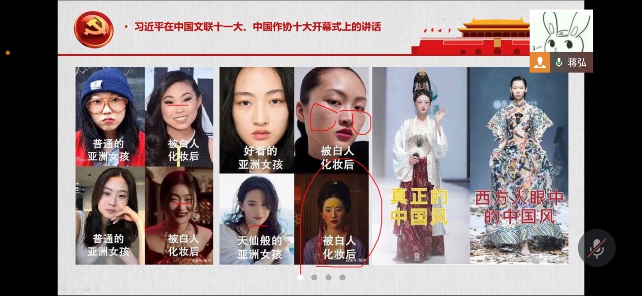 第一个事例讲的是国内一些艺术工作者为了迎合西方对中国人的审美,并让中国人接受西方认可的脸就是高级脸这一观点,在艺术作品中故意给模特化“眯眯眼”妆。蒋弘认为,对于这种文艺作品,我们要予以批判与摒弃。原因是:第一,西方世界中“眯眯眼”就是歧视亚洲人的一种符号;第二,面对由歧视性符号带来的侮辱,一旦你不抗争,那么侮辱你的人之前或之后基于这个形象而所做的一切诋毁、中伤、污蔑、诽谤就全部合理化、正当化了。你将被永远烙上这个歧视性符号,被完全脸谱化、污名化,以后即使想辩白也会显得软弱无力。