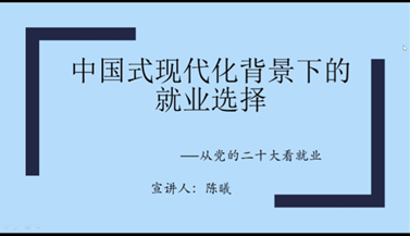陈曦以《中国式现代化背景下的就业选择》为题给全体党员讲了一堂“接地气”的党课。讲述了什么是中国式现代化,并从国家要求、社会需求、学校希求以及个人追求四个方面明确了在中国式现代化背景下,高校毕业生的就业选择需要明确:“为何选择”、“选择哪里”和“怎样选择”这几个问题。