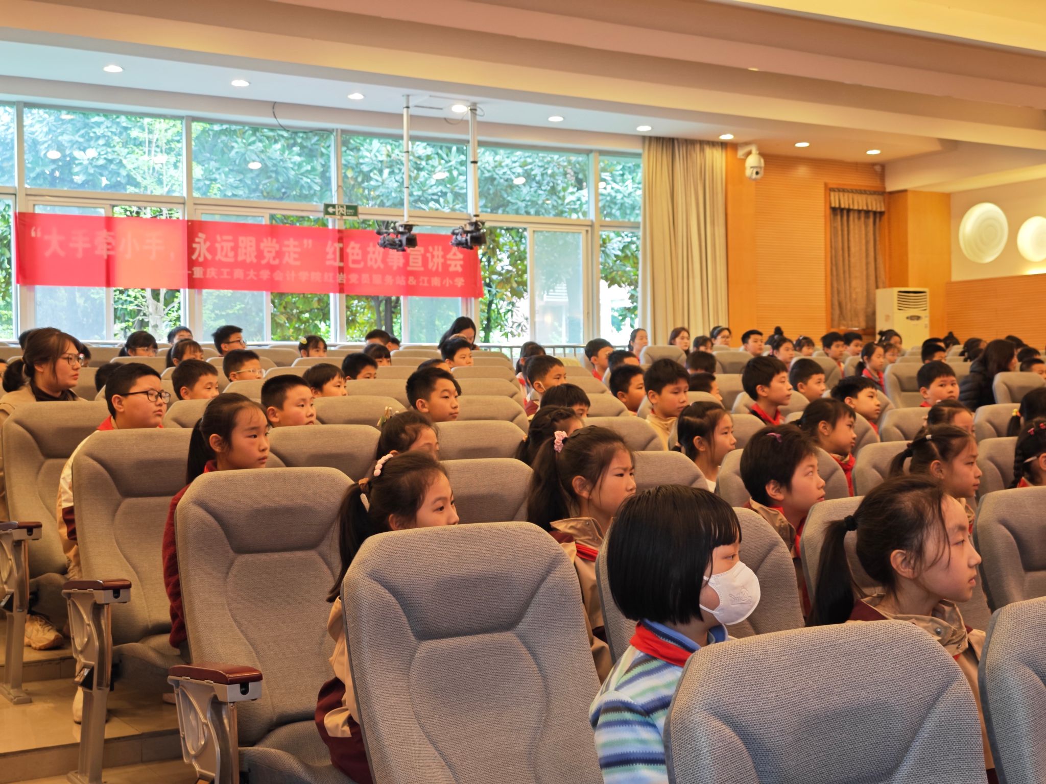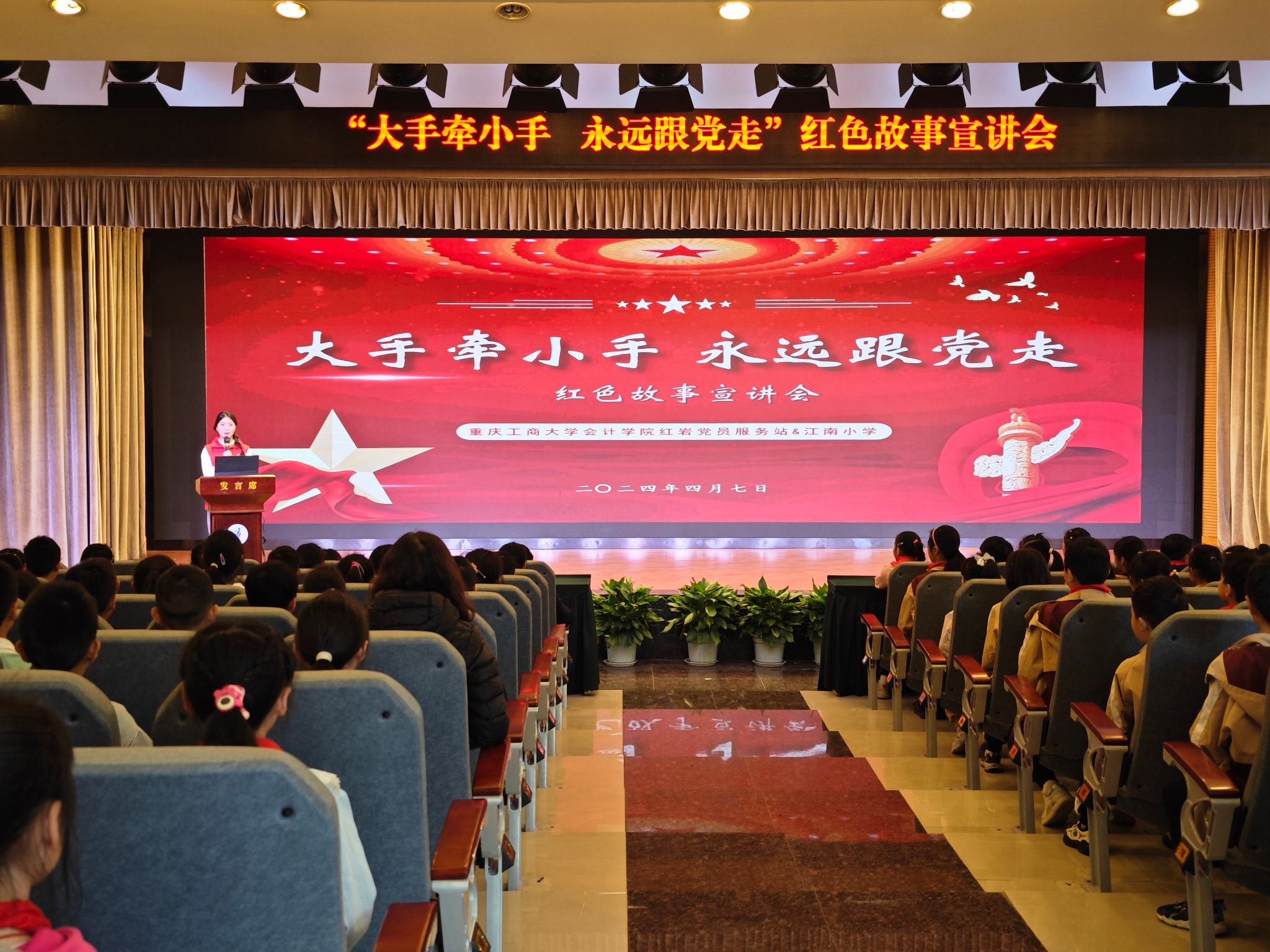 一双双满含希冀的眼睛、一次次踊跃积极的互动、一声声坚定响亮的回答……2024年4月7日,由重庆工商大学9428cn太阳集团古天乐红岩党员服务站主办的“大手牵小手,永远跟党走”红色故事宣讲会在江南小学开展。活动通过宣讲一个个引人入胜的红色故事,不时穿插趣味十足的互动小游戏,为江南小学的小学生们带去了一堂别开生面的思政课,这也是推进大中小学生思想政治教育一体化建设的生动实践。