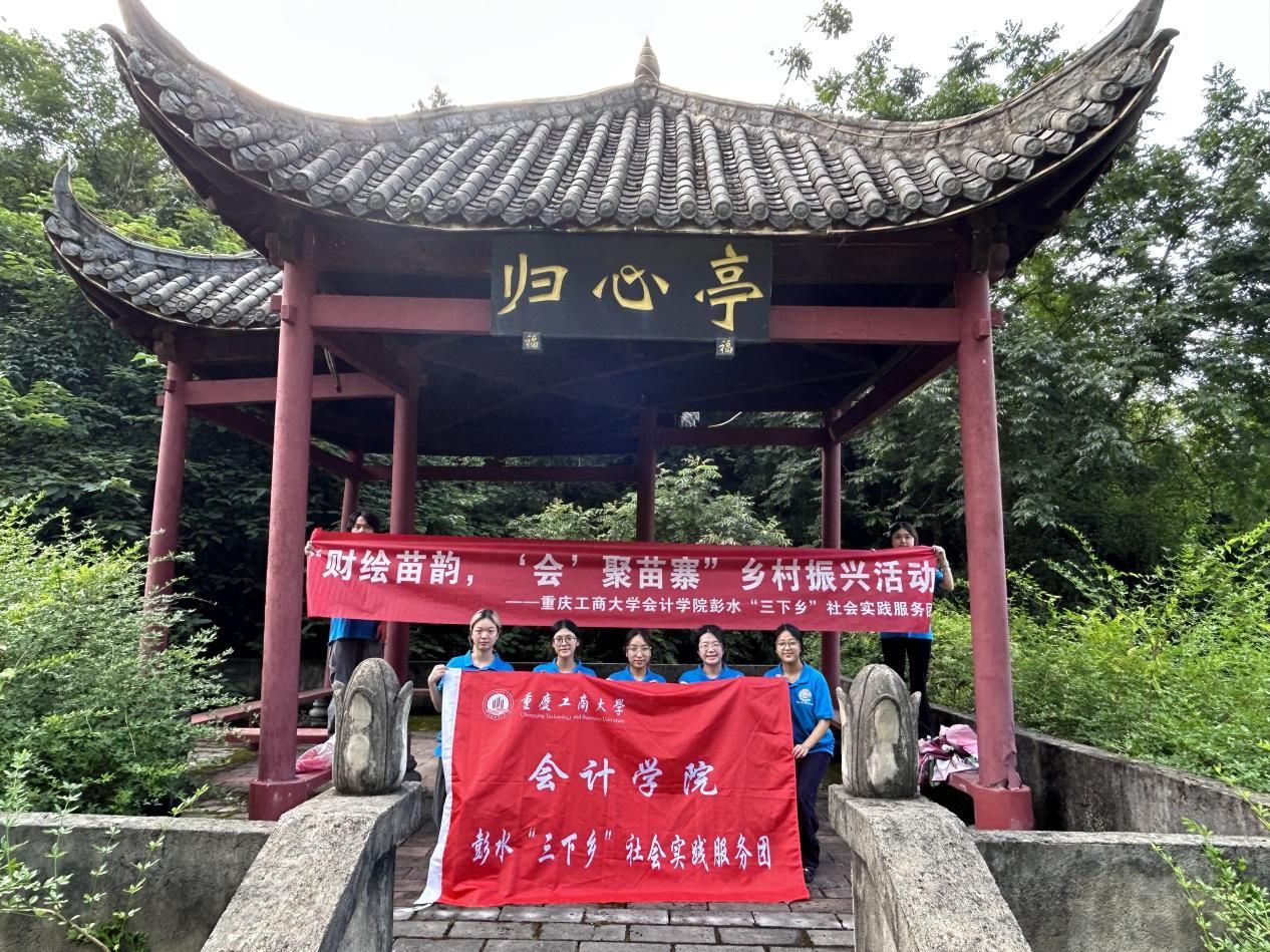 2025年7月9日,重庆工商大学9428cn太阳集团古天乐“财经苗韵,‘会’聚苗寨”乡村振兴促进团全体成员在彭水县高谷镇兴隆苗寨开展“苗韵文化探源行”主题活动。本次活动聚焦苗寨独特建筑风貌与文化地标,通过实地踏勘登山步道沿线人文遗址,重点考察彭水县高谷镇归心亭,深度挖掘苗族文化遗产内涵,以财经专业视角赋能乡村文化振兴。