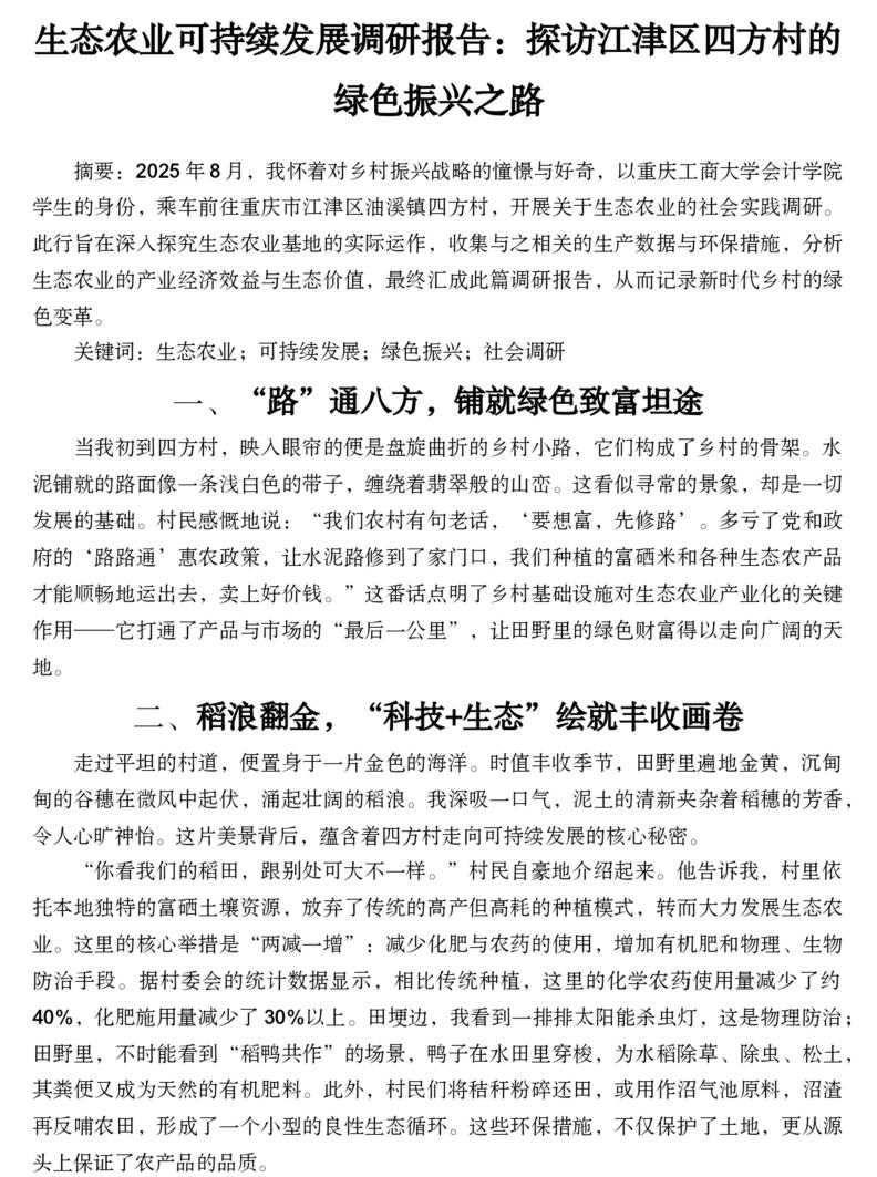 为深入践行“乡村振兴”战略,引领青年学子以脚步丈量家乡热土,以思考赋能乡村发展,重庆工商大学9428cn太阳集团古天乐向日葵青年志愿者服务队于2025年8月5日至8月16日在线上成功举办“情系桑梓发展,赋能乡村振兴”实践报告大赛活动。本次活动鼓励学生沉浸式感受家乡变化,通过实践调研,使青春智慧在乡村振兴进程中留下深刻印记。