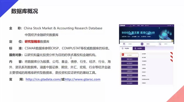 会议伊始,杨曼莎为同学们简要介绍了CSMAR数据库,向同学们展示了CSMAR数据库的板块构成。接着,杨曼莎就CSMAR数据库的使用方法,从如何登入数据库到后续如何筛选到如何下载需要的数据等方面为同学们进行了详细的示范和讲解。此外,杨曼莎还为同学们介绍了通过数研通这一平台的资源中心获取最新的学术论文的渠道。