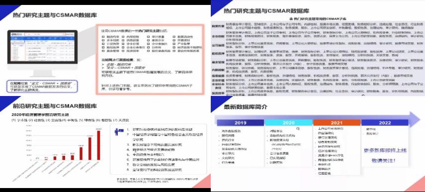随后,杨曼莎从CSMAR与实证研究创新方面为同学们展示了目前的热门研究主题和其关联数据库。杨曼莎还从新冠肺炎疫情对全球经济的影响及挑战、中国经济学构建与中国特色社会主义政治经济学研究、新发展理念下的高质量发展研究、数字经济与经济发展新动能、全面脱贫与乡村振兴、新发展格局下的全球价值链重构与中国应对、数字金融的发展与风险监管和全球变局下的科技创新发展研究这8个前沿热点导入,从相关案例论文的写作思路出发,为同学们的研究开拓了视野。在讲座最后,杨曼莎也向同学们推荐了CSMAR实证研究主题工作坊的往期精彩课程,以解决论文写作中遇到的各种问题。