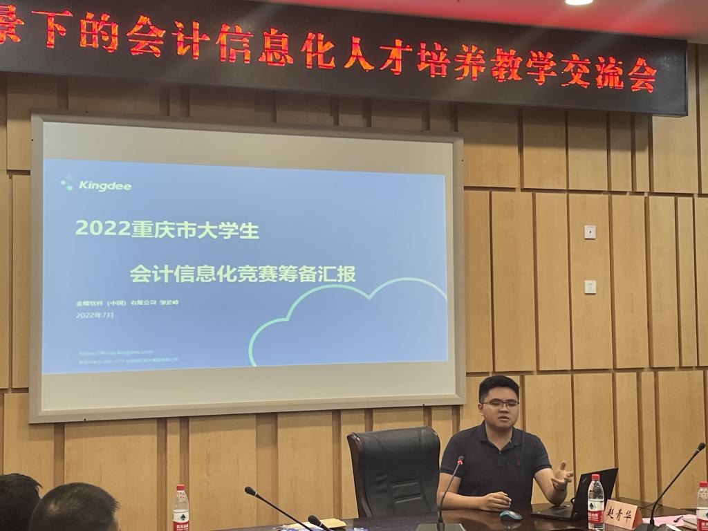 金蝶精一重庆公司负责人邹於峰汇报了重庆市大学生会计信息化大赛的筹备情况,比较分析了今年比赛和2021年首次比赛的变化,该比赛是由我校承办,教育部会计信息化课程虚拟教研室、重庆市成渝数智会计虚拟教研室和重庆市会计信息化名师工作室联合设计,金蝶软件(中国)有限公司协办的市级比赛。目前重庆市19所本科院校的代表队报名参加了已经完成的校赛阶段,初赛和决赛将在我校举行。