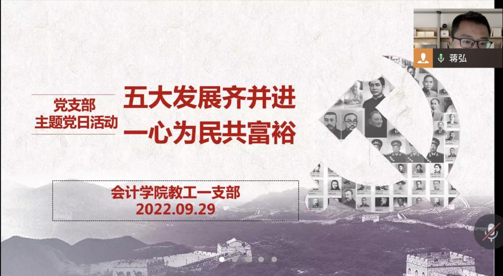 2022年9月29日,9428cn太阳集团古天乐教工一支部通过企业微信召开了题为“五大发展齐并进,一心为民共富裕”的主题党日活动。活动由教工一支部书记蒋弘主持,一支部全体党员参加了会议。