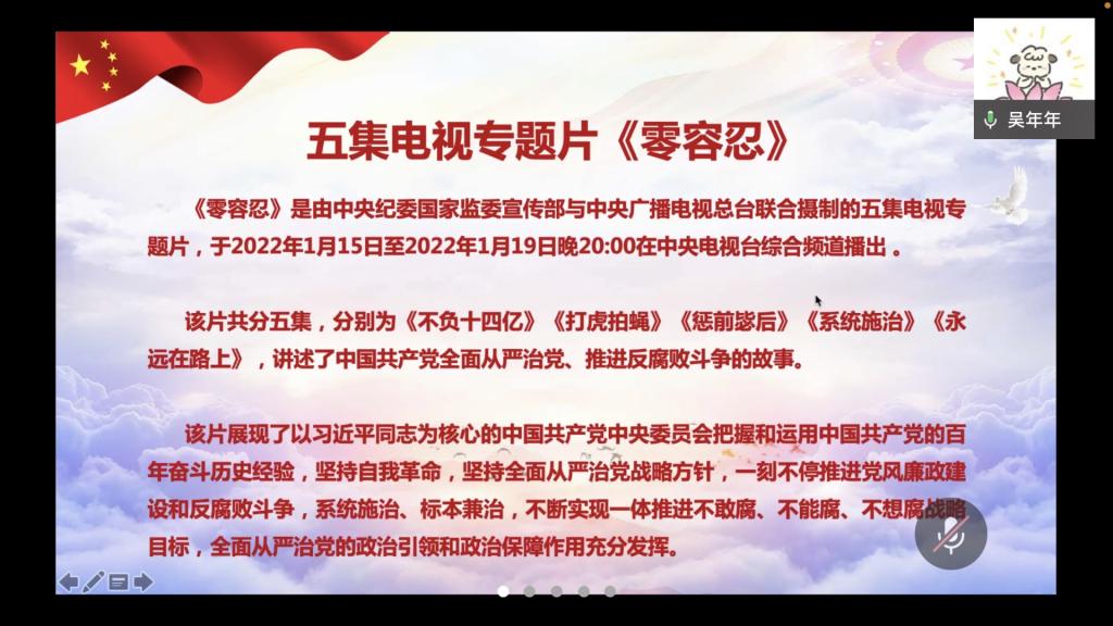 在 “好…好…学习”专栏,吴年年老师给大家推荐了专题片《零容忍》,该片共分为《不负十四亿》《打虎拍蝇》《惩前毖后》《系统施治》《永远在路上》五集,讲述了中国共产党全面从严治党、推进反腐败斗争的故事。吴年年通过第五集《永远在路上》中的周江勇干预司法案、“恋子虎”张琦案和“小官巨贪”张雨杰案透视了反腐败斗争的长期性、复杂性、艰巨性,和我党永葆自我革命精神的伟大性,让各位党员深刻认识到全面从严治党永远在路上、党的自我革命永远在路上。