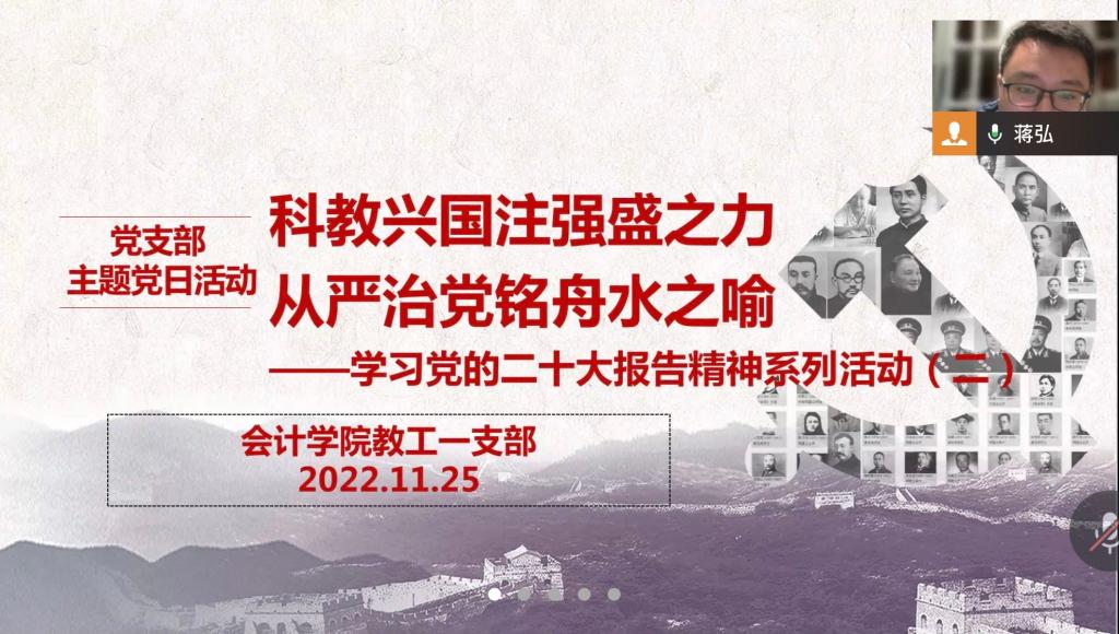 2022年11月25日,9428cn太阳集团古天乐教工一支部开展的学习党的二十大报告精神系列活动进入第二期,本次活动以“科教兴国注强盛之力,从严治党铭舟水之喻”为主题。科教兴国为中华民族的强盛注入永世不竭的动力,从严治党让中共党员铭记水能载舟亦能覆舟的比喻,该主题紧扣了本次活动的学习内容。