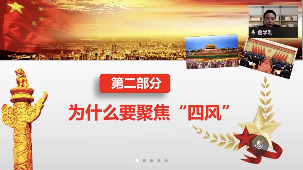 接着,詹学刚结合报告第十五部分“坚定不移全面从严治党,深入推进新时代党的建设新的伟大工程”,从纠正“四风”的角度谈了谈党的作风建设。他指出,“四风”即形式主义、官僚主义、享乐主义和奢靡之风,是习近平总书记对党内作风存在的突出矛盾和突出表征的深刻概括。“四风”违背了我党的性质和宗旨,损害了党群干群关系。接着,詹学刚还举例剖析了“四风”的主要表现,分享了习总书记关于纠“四风”的金句。他结合工作实际说道,我们高校教师申报的课题应当对国家、地方、部门和行业有重要理论和现实意义,注重实效,这个过程中要坚决抵制和杜绝形式主义,让作风建设永远在路上。