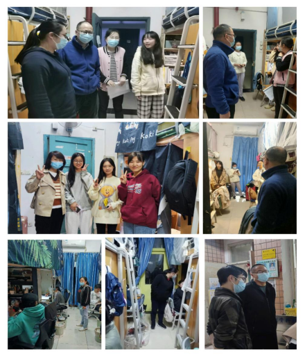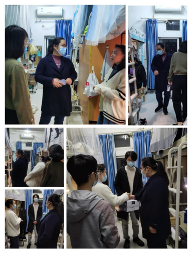 疫情期间,辅导员们担当核酸信息采集工作者、核酸检测秩序引导员;化身“大白”为封控楼栋的学生送餐分餐、代购急需物资;实行分片区、分楼栋、分时段值班值守,辅导员走进学生宿舍,了解学生网课情况、思想动态、心理状态和生活情况,鼓励同学加强与任课老师的沟通,合理规划作息时间,注意用电安全,适时增添衣物,谨防感冒,同时安抚疏导学生情绪,收集学生诉求,想学生之所想,急学生之所急。下面只是一些片段:11月15日凌晨3点,学生突发心绞痛,郝颖副书记和辅导员程洁及时协调学生就医。好在学生有惊无险,于凌晨5点多平安返校。11月16日上午,郝颖副书记带领辅导员前往寝室探望学生,送去慰问品,并帮助学生解决就医经济困难问题。11月16日下午,学生父亲给辅导员发来一条短信:“班主任你好,我是某某某的父亲,今天孩子打电话说你们领导们很关心他,还去看他,还给他费用报销,我表示感谢!” 对于远在新疆哈密务工的父亲,这是怎样的朴实和真挚!师者父母心,父母亦安心!11月21日晚,辅导员吴金珂的学生身体抱恙,买不到药品。“别怕,有辅导员在!”尽管时间已晚,吴老师马上为该生送去食物,积极协调解决药品问题。辅导员们用爱与行动诠释使命担当,陪伴学生共渡难关,切切实实把“暖心剂”注到了学生们的心坎上。