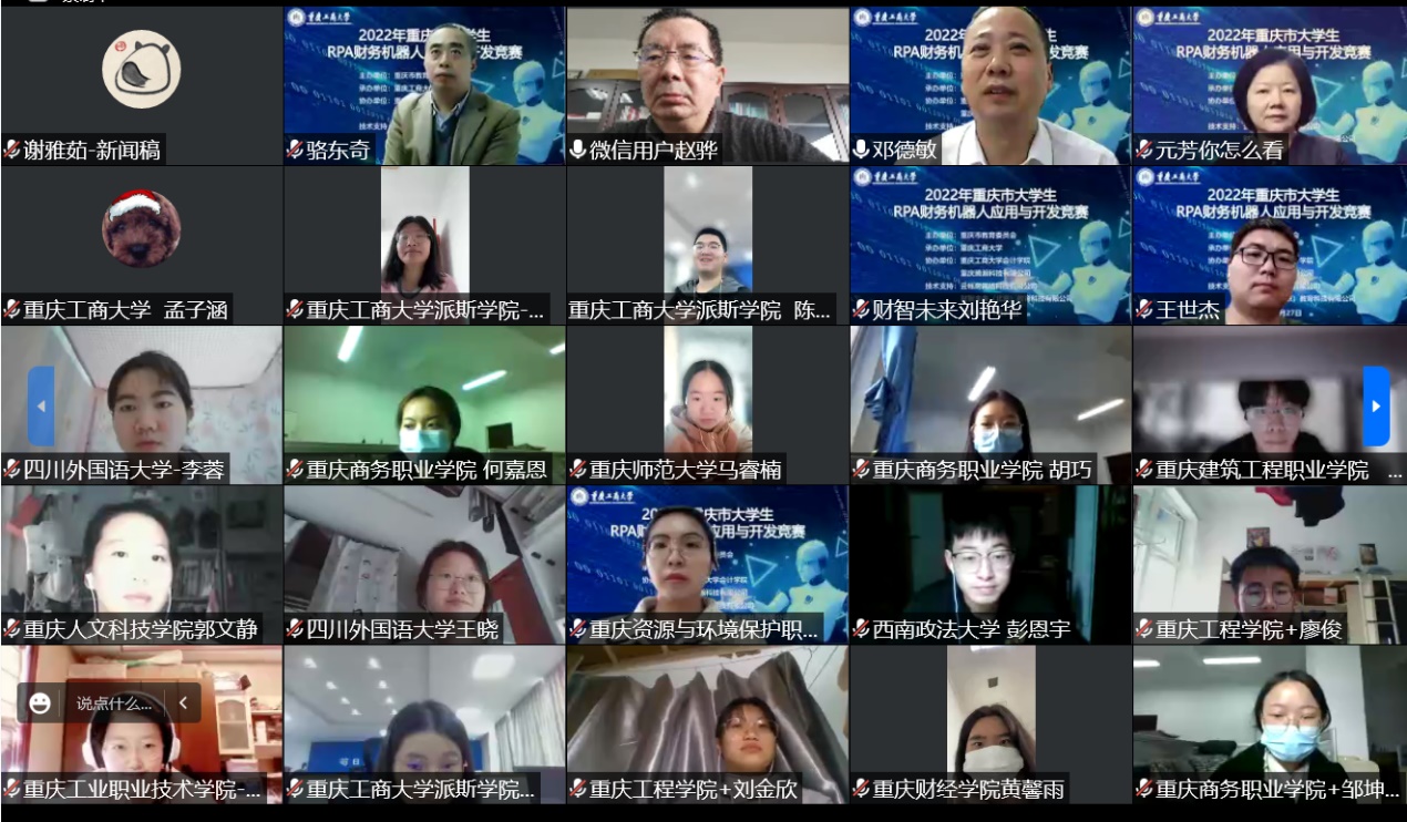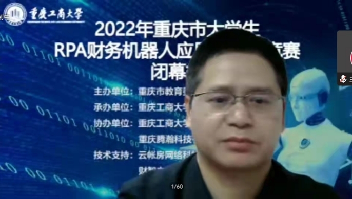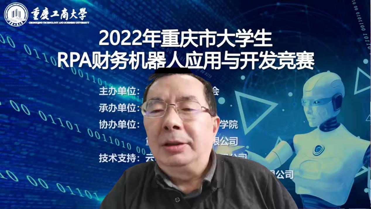为紧跟数字化时代步伐,检验和展示重庆市高校教学改革成果和学生人工智能技术应用能力,推动提升高校经管类专业人才数智化水平,进而加快重庆市企业数智化进程,推动地方经济发展。由重庆市教委主办,重庆工商大学承办,重庆腾瀚科技有限公司、重庆工商大学9428cn太阳集团古天乐协办,云帐房网络科技有限公司、财智未来(北京)教育科技有限公司提供技术支持的2022年重庆市大学生RPA财务机器人应用与开发竞赛于11月27日顺利结束。全市共有34所院校的67支队伍参加本次竞赛。重庆市教委高教处处长蒋云芳、重庆工商大学副校长赵骅、重庆工商大学教务处处长骆东奇等出席了竞赛开幕式。重庆工商大学9428cn太阳集团古天乐党委书记邓德敏、副院长蒋水全分别主持了竞赛开幕式和闭幕式。本次决赛采取线上方式进行。