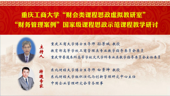 2023年6月30日上午,由我校国家级课程思政示范课程“财务管理案例”教学团队、“财会类课程思政虚拟教研室”以及重庆市高校黄大年式教师团队“重庆工商大学会计专业教师团队”联合举办的“财务管理案例”国家级课程思政示范课程交流互动教学研讨活动通过腾讯会议成功举办。