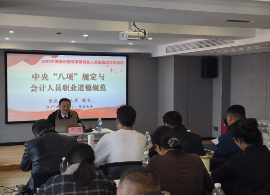 培训期间,我院党员教师顾飞、刘淑蓉、石恒贵分别以“学习贯彻习近平新时代中国特色社会主义思想主题教育——学好新思想 做好财务人 服务教育强国建设”、“中央‘八项’规定与会计人员职业道德规范”“行政事业单位内部控制”、“国有资产管理与政府采购”、“新中小学财务制度、基本建设财务制度”、“新行政事业单位财务规则”、“预算绩效管理条例与预算绩效编报、监控及自评”“行政事业单位内部控制”、“中小学校会计基础工作规范”、“中小学校会计基础工作实务操作”为主题举办了系列专业讲座,为参训财务人员立足本职岗位的工作要求,深入学习贯彻习近平总书记关于财务工作的重要论述,进一步贯彻落实中共中央办公厅、国务院办公厅印发的《关于进一步加强财会监督工作的意见》,忠诚担当、勤勉尽责,进一步发挥好财会监督和财务工作在学校落实立德树人根本任务、推进民族地区教育事业高质量发展中的监督治理作用提供了行业针对性强、教学水平度高、学习体验感好的体系化专业讲座,受到了海南州教育系统财务人员赴重庆市培训班带队领导以及参训财务人员的一致好评。