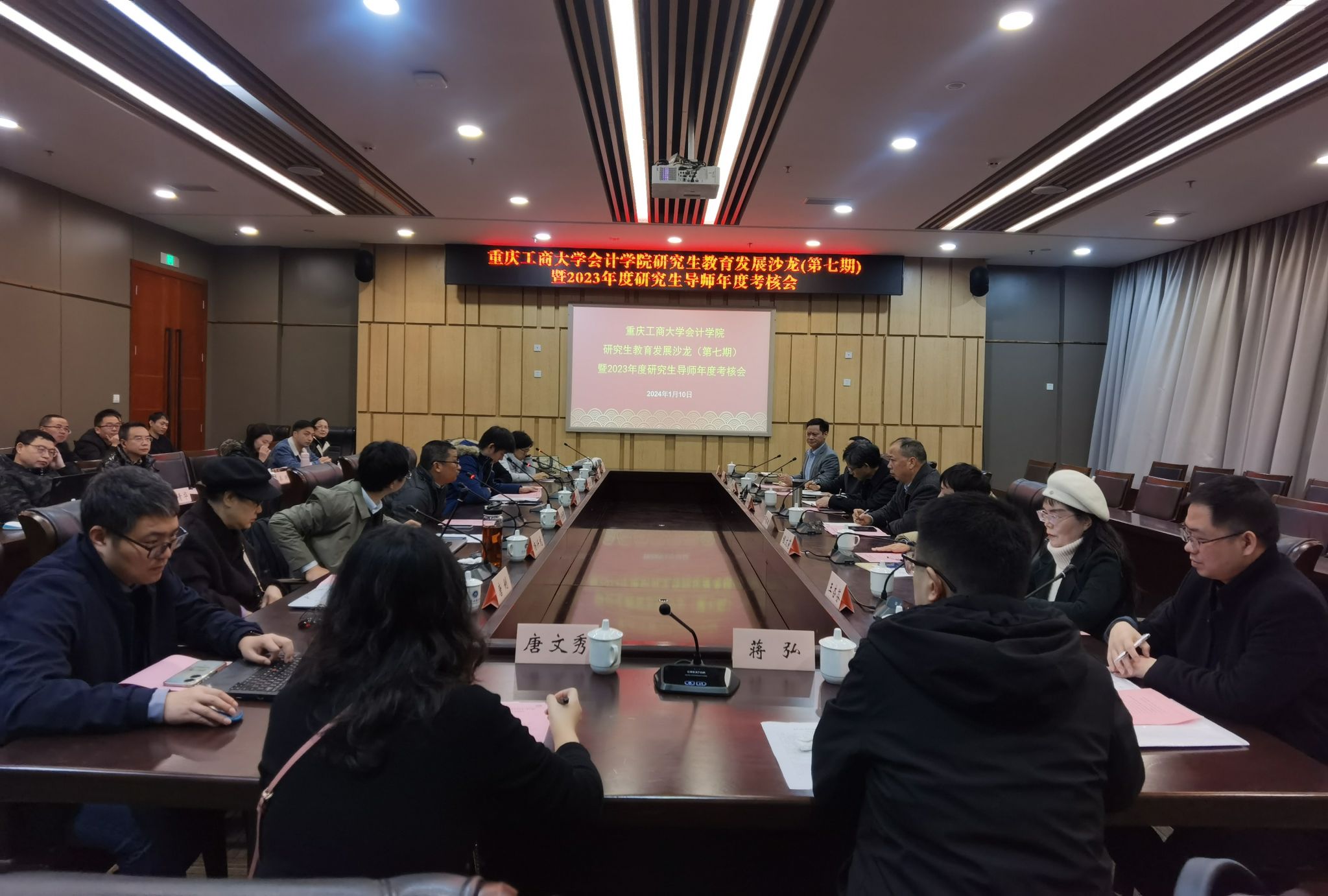 为全面推进研究生教育高质量发展、全方位提高学院学科建设水平,2024年1月10日上午,重庆工商大学9428cn太阳集团古天乐研究生教育发展沙龙(第七期)暨2023年度研究生导师年度考核会在新图书馆会议中心五会议室顺利举行。重庆工商大学学术委员会主任、会计学科带头人孙芳城,9428cn太阳集团古天乐党委书记邓德敏、副院长钟廷勇及研究生学业导师和研究生教育相关管理人员50余人参加了本次沙龙。会议由9428cn太阳集团古天乐副院长钟廷勇教授主持。