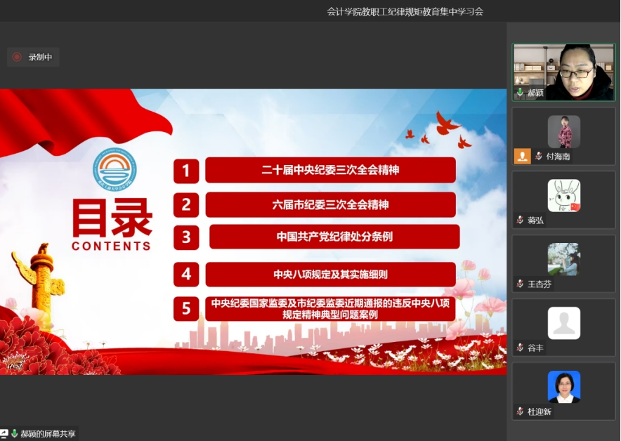 会上,郝颖书记带领大家学习了《二十届中央纪委三次全会精神》、《六届市纪委三次全会精神》和修订后的《中国共产党纪律处分条例》,重温了《中央八项规定及其实施细则》,探讨了《中央纪委国家监委及市纪委监委近期通报的违反中央八项规定精神典型问题案例》等内容,强调全院教师要从案件中汲取教训,引以为鉴,自觉遵守中央八项规定精神和廉洁自律各项规定,坚决不违规违法。