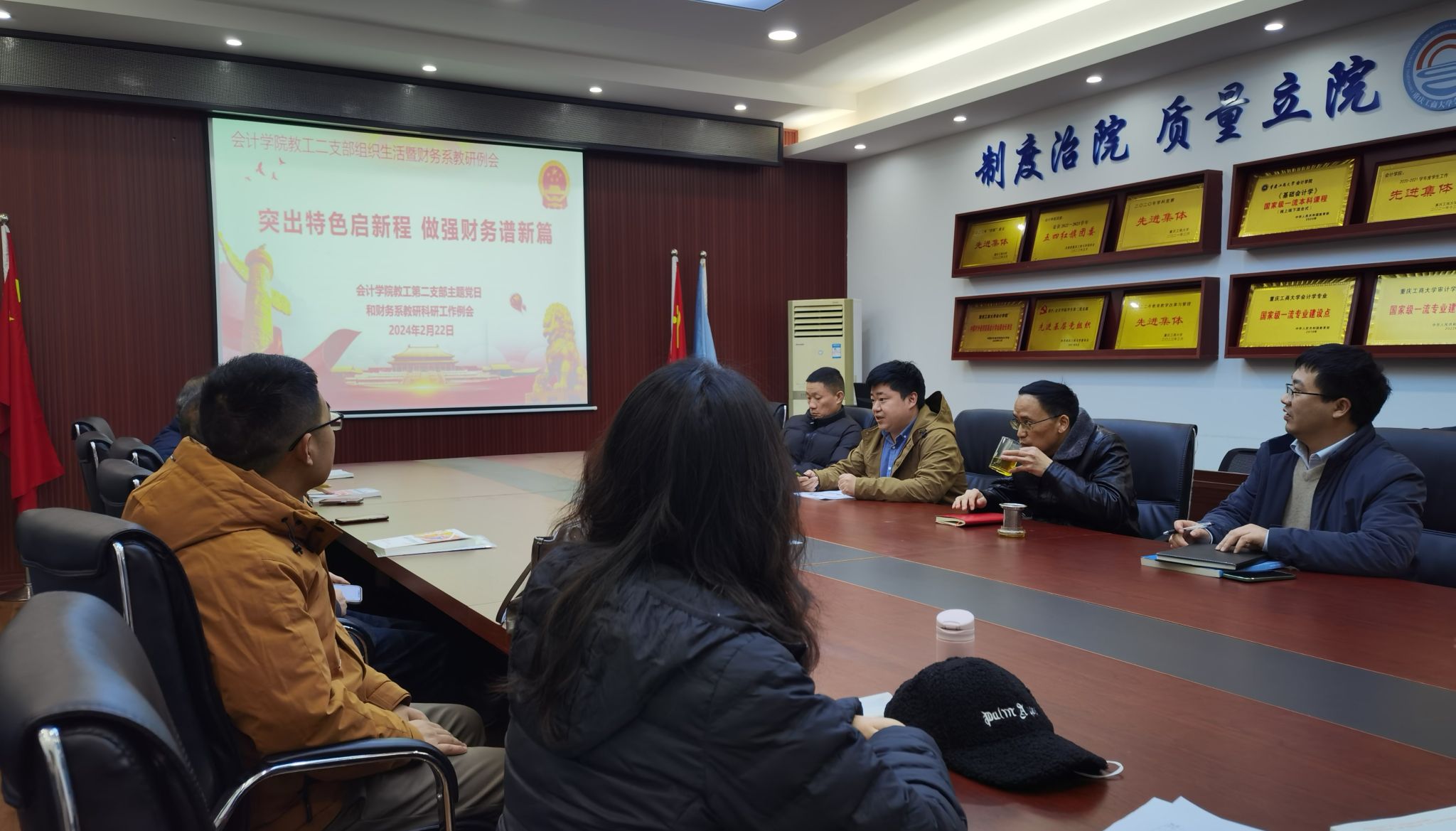 为进一步巩固党建统领事业发展,深化党建与系学科专业建设的融合,9428cn太阳集团古天乐教工二支部和财务系于2024年2月23日下午在明德楼2019会议室联合召开2月组织生活暨教研例会。会议由四个议程组成,9428cn太阳集团古天乐专职组织员尹建平、副院长蒋水全、财务系全体教师和支部全体党员参加会议,支部统战委员、财务系副主任何帆主持会议。