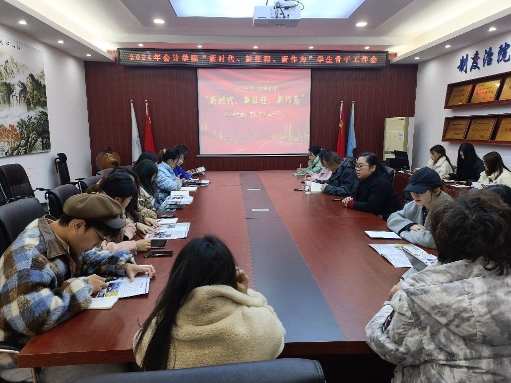 会议伊始,郝颖书记从工作情况、特色工作和工作成效三个方面介绍了学院在过去一年中学生工作,着重介绍了“一核、二翼、三有、四力、五育”卓越会计人才工程的开展情况和“会”乐有约、五约换心的特色工作;同时解读了学院2024年上半年的学生工作要点,希望学生组织继续勇挑重担、坚持人民至上,展现新时代青年的担当,并鼓励学生组织凝心聚力、携手共进,切实做到“服务学院发展”“服务专业发展”“服务学生发展”。