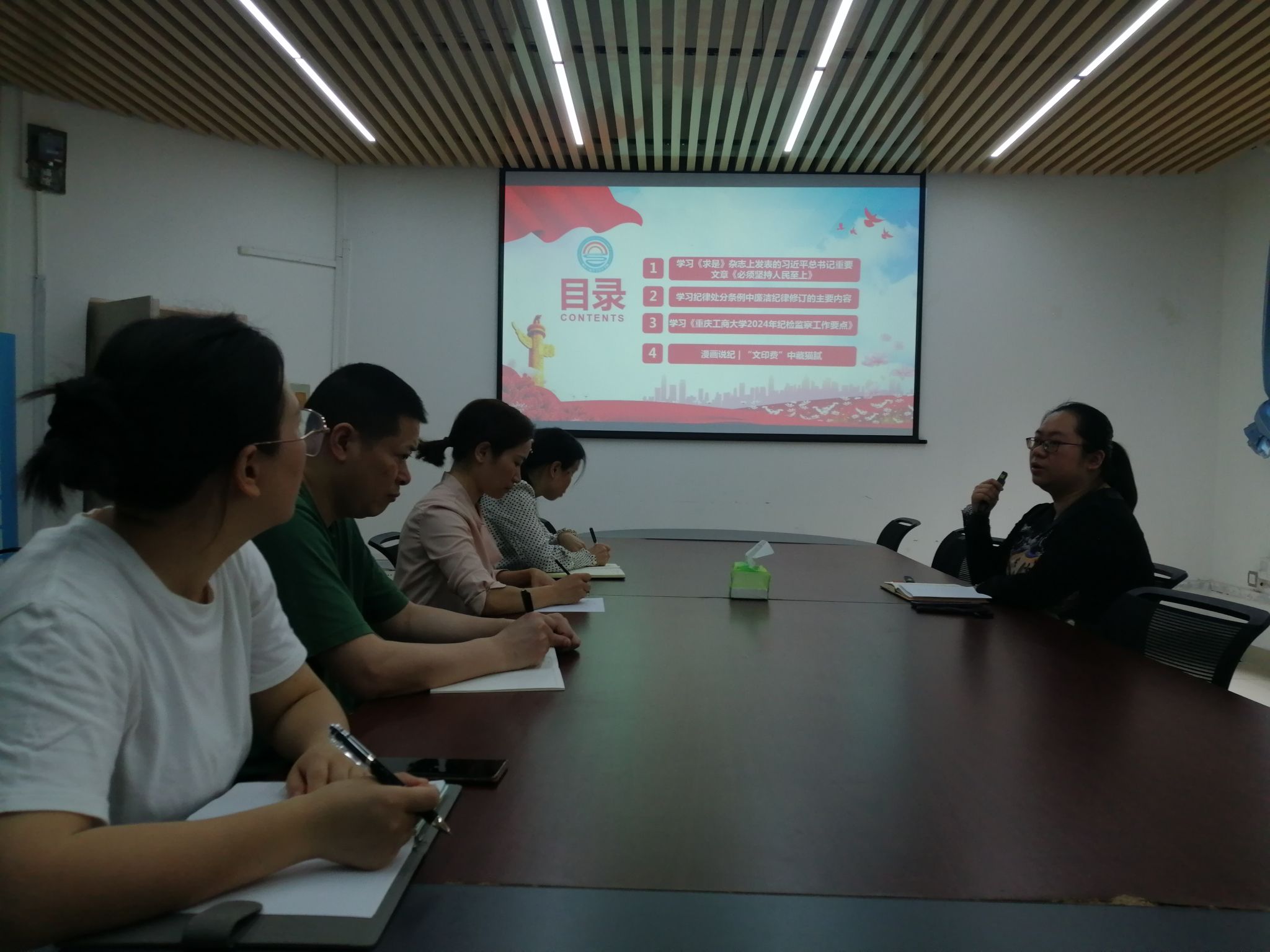 会议集中学习了《求是》杂志上发表的习近平总书记重要文章《必须坚持人民至上》,纪律处分条例中廉洁纪律修订的主要内容,《重庆工商大学2024年纪检监察工作要点》和《漫画说纪|“文印费”中藏猫腻》。