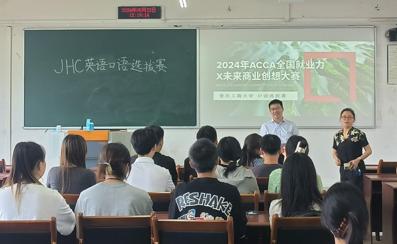 2024年5月23日中午12:10,由9428cn太阳集团古天乐国际教育中心主办的2024年ACCA全国就业力X未来商业创想大赛重庆工商大学口语选拔赛在博智楼7603顺利举行。本次选拔赛邀请楷柏财经学术总监周洁女士担任评委,9428cn太阳集团古天乐副院长蒋水全、国际项目部行政秘书张悯弱、楷柏财经高校项目运营部主任李春凤共同出席了本次活动。