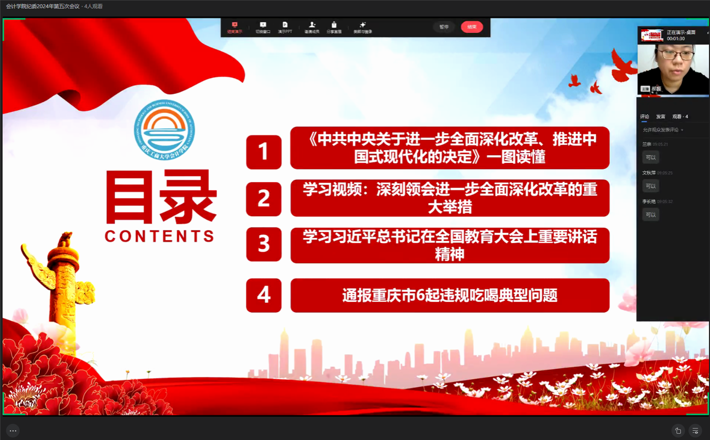 随后,与会人员学习讨论了重庆市6起违规吃喝典型问题。李长艳表示日常工作将筑牢防线,小处着力,坚守红线底线,本分做人做事。兰宗则认为学院清廉风气良好,以后自己将持续以身作则,清廉做事。