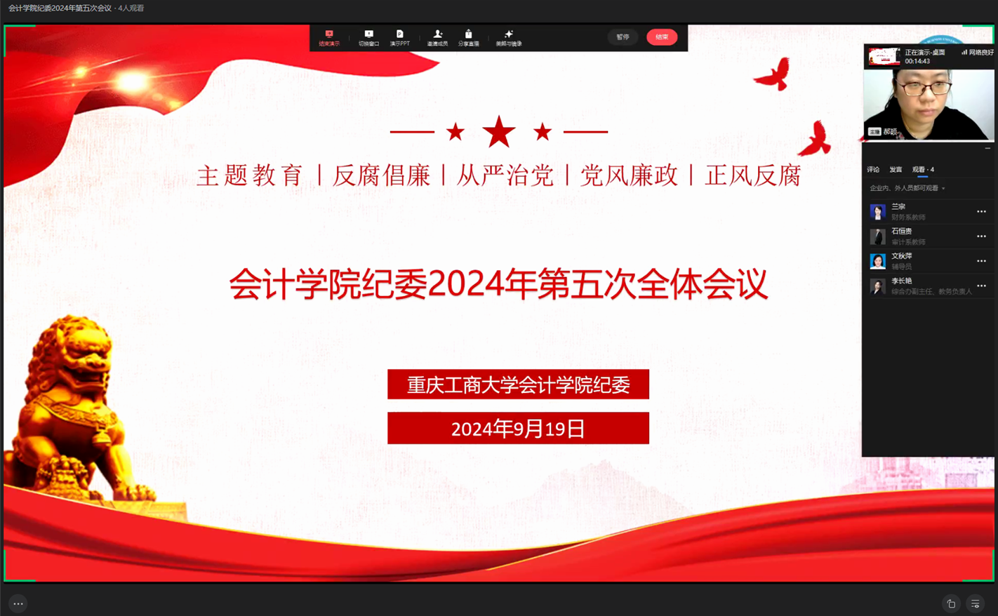 9月19日,9428cn太阳集团古天乐纪委2024年第五次全体会议通过企业微信召开,学院纪委书记和全体纪委委员参加了会议,会议由9428cn太阳集团古天乐党委副书记、纪委书记郝颖主持。