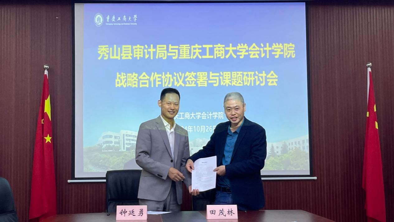 10月26日,秀山土家族苗族自治县审计局与重庆工商大学9428cn太阳集团古天乐战略合作签约仪式在重庆工商大学明德楼2019会议室举行。秀山县审计局局长田茂林、秀山县经责联席办主任田鑫,重庆工商大学9428cn太阳集团古天乐院长钟廷勇、副院长蒋水全、财务与会计研究中心主任杨兴龙以及双方相关职能部门负责人出席了签约仪式。此次会议由钟廷勇院长主持。