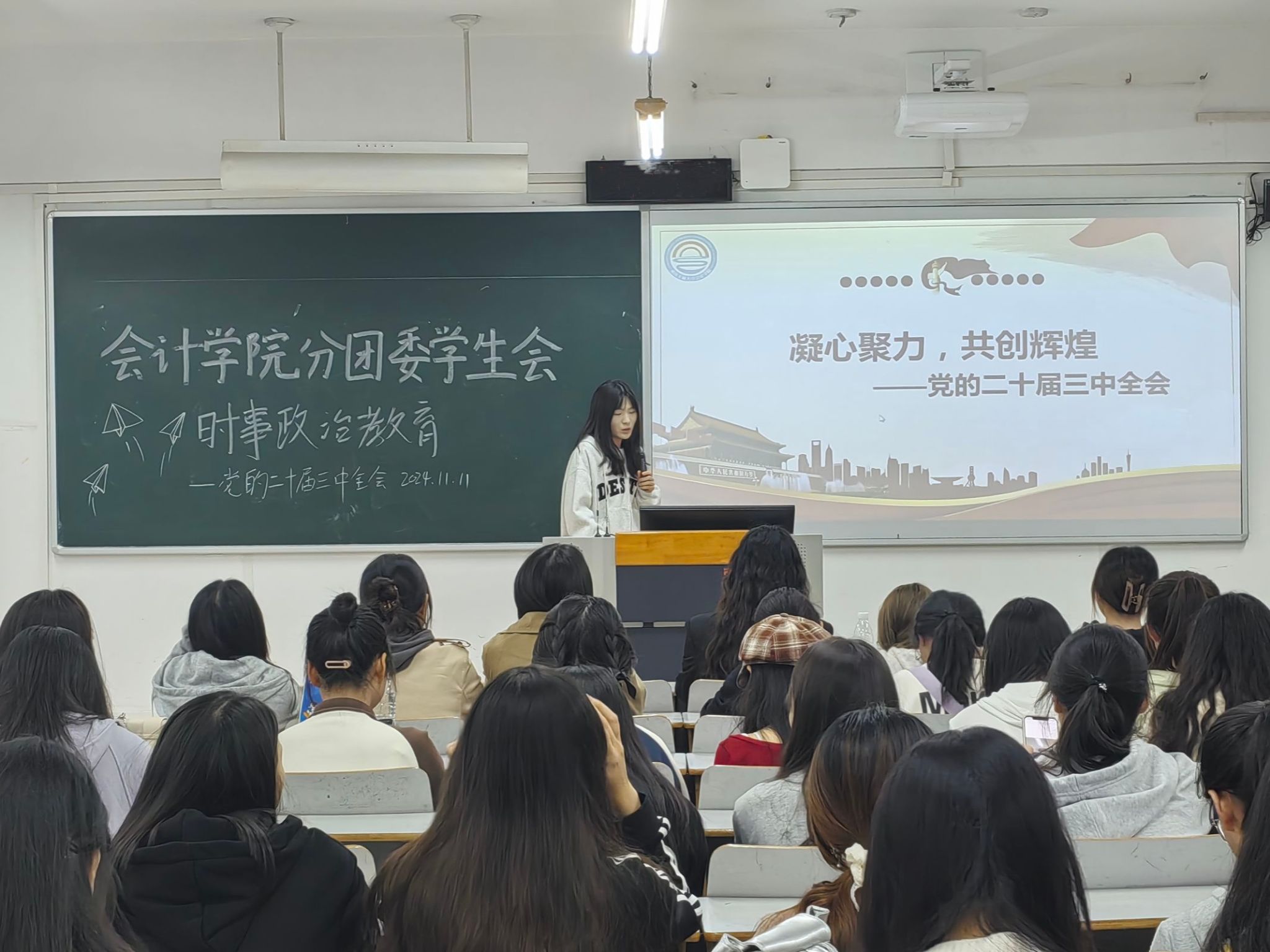 2024年11月11日,9428cn太阳集团古天乐分团委在南岸校区博智楼召开学习贯彻党的二十届三中全会精神专题学习会。9428cn太阳集团古天乐分团委学生会全体成员参加,学生会主席团成员龚悦主持。