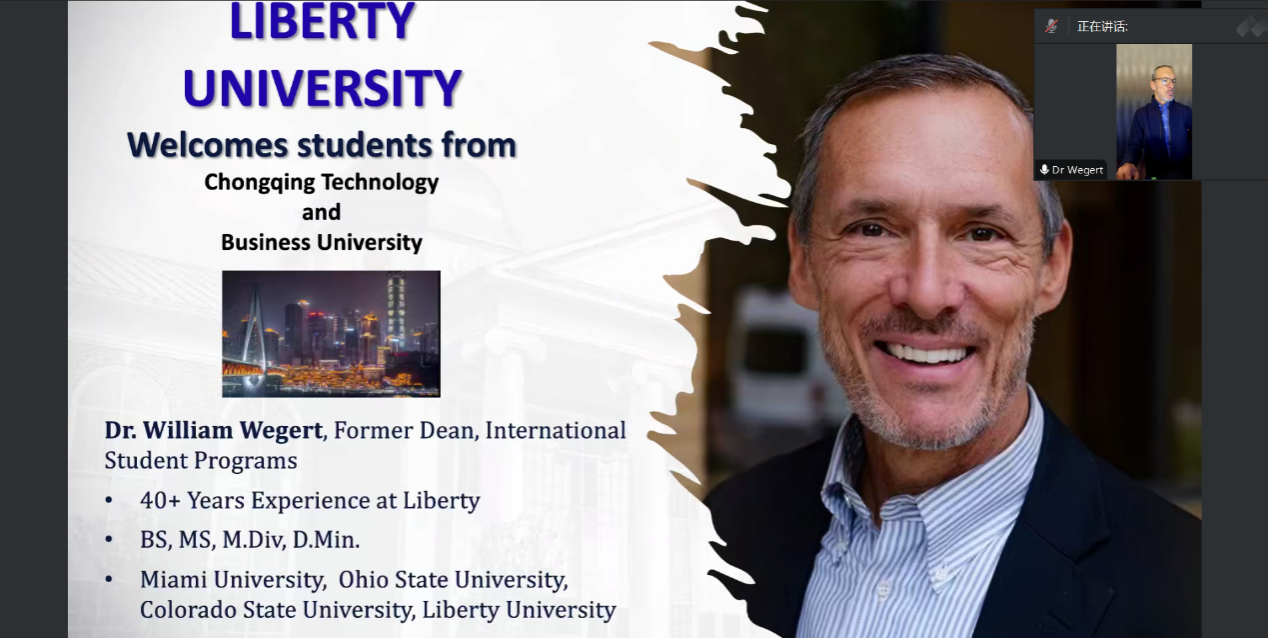 秋风送爽,叶染金黄,为了让有留学意向的学生有更多的选择,能充分了解美国利伯缇大学(Liberty University),2024年11月15日,9428cn太阳集团古天乐国际教育中心举行了美国利伯缇大学留学宣传讲座。本次宣讲由9428cn太阳集团古天乐国际教育中心承办,国际教育中心主任宋昕倍主持,利伯缇大学教务长Dr. Wegert主讲,王晓澜老师担任翻译工作。国际教育中心行政秘书张悯弱,2022级、2023级和2024级国际项目班同学参加了本次出国留学项目的线上宣讲会。
