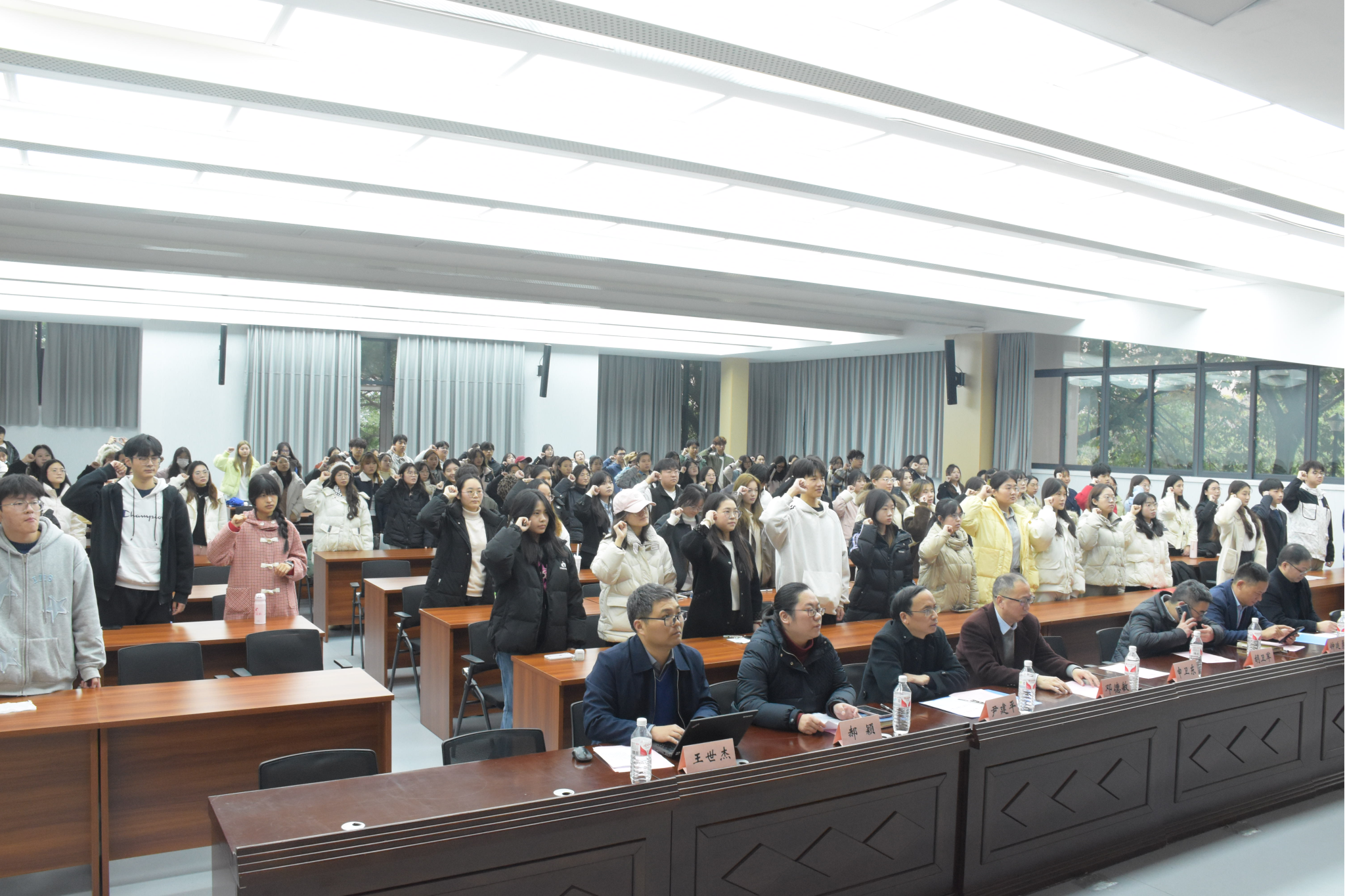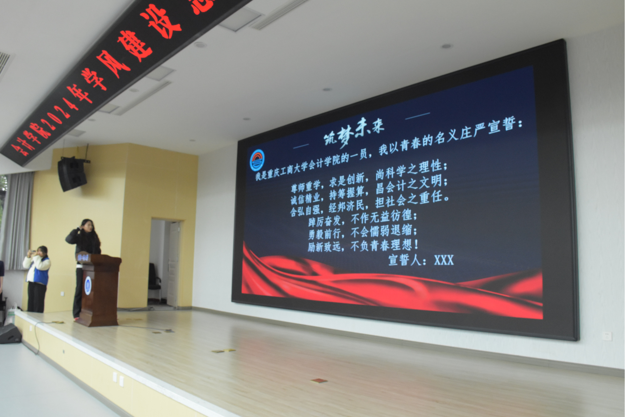 2022级会计四班周夕曦带领全体成员进行宣誓,许下了会院学子的庄严承诺:尊师重学,求是创新,尚科学之理性;诚信精业,持筹握算,昌会计之文明;含弘自强,经邦济民,担社会之重任。踔厉奋发,不作无益彷徨;勇毅前行,不会懦弱退缩;笃行不怠,不负青春理想!