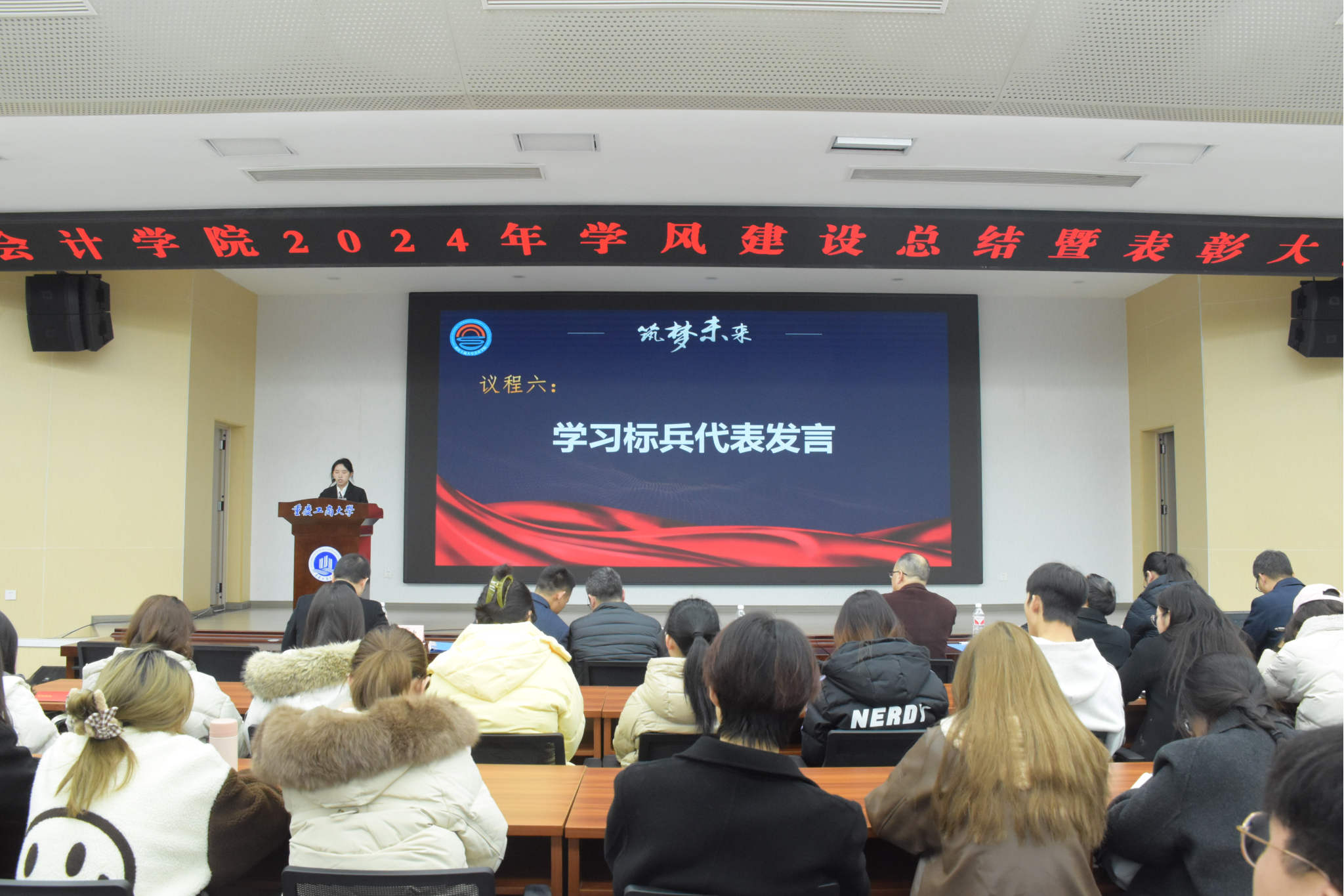 2021级智能会计班毛晓如同学作为学风建设先进班级代表发言。她代表班级对学院与老师表达诚挚的感谢,她认为这份荣誉是属于个人和班集体的,要牢记学习是第一要务,班级要牢记“厚德博学,求是创新”的校训。只要凝聚集体力量,一同朝着目标砥砺前行,每个人都能最大程度实现自己的人生价值。2022级会计班艾小珍同学作为学习标兵代表发言。她回顾了自己过去两年的大学时光,并根据自己的学习经历作出相应分享,她提到学习是因人而异的,每一个人都要找到属于自己的方法,不盲目照搬他人,根据自身学习特点制定计划,准确认识自己,不驰于空想,不骛于虚声。