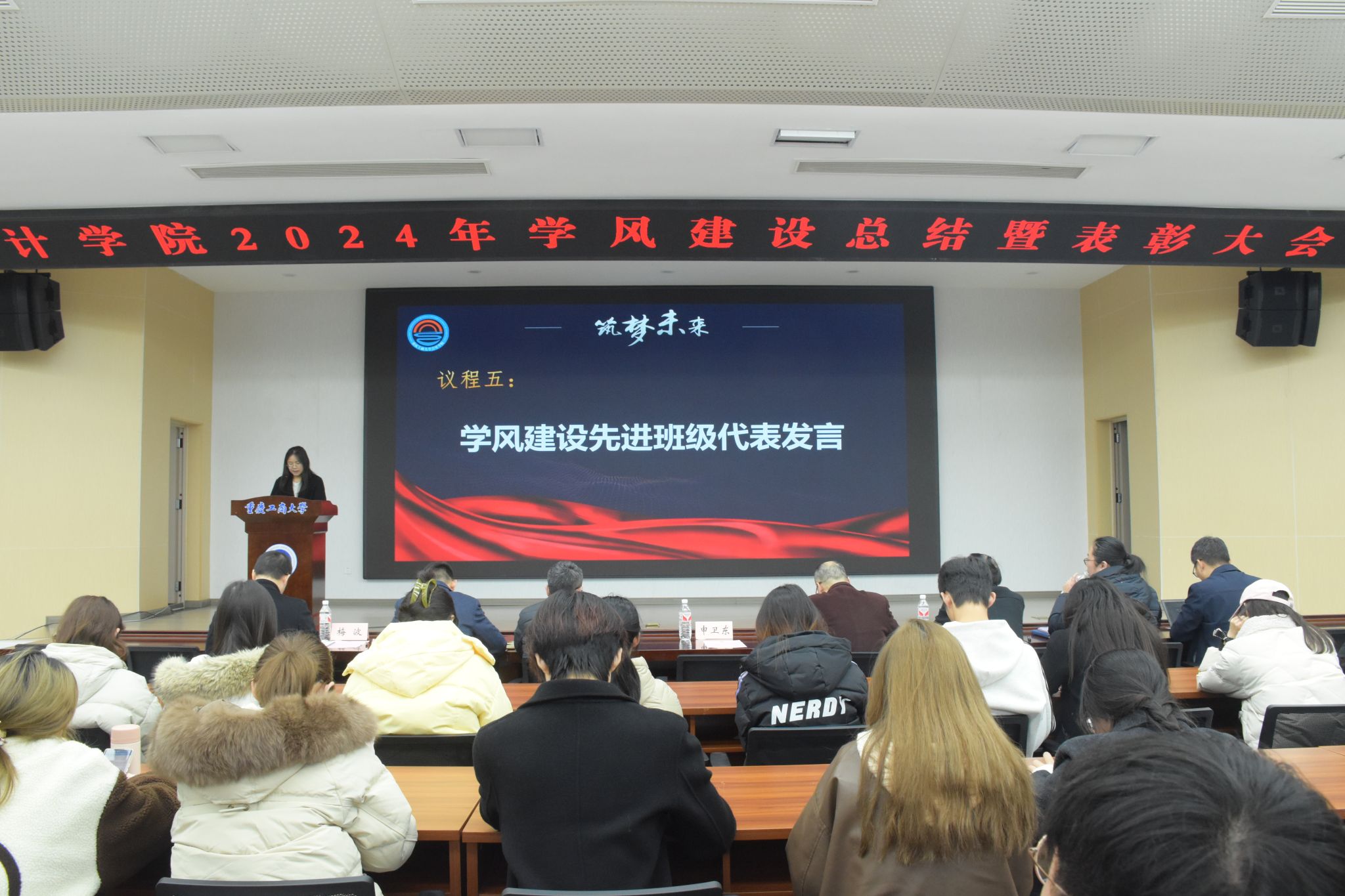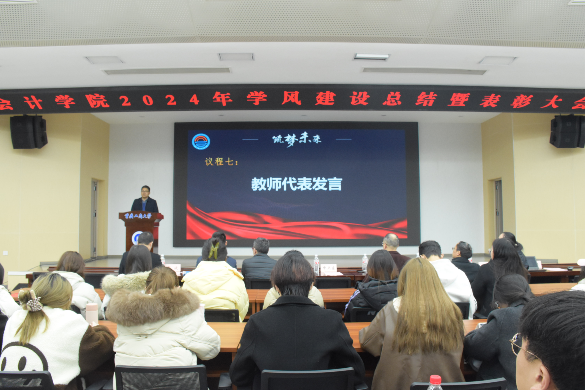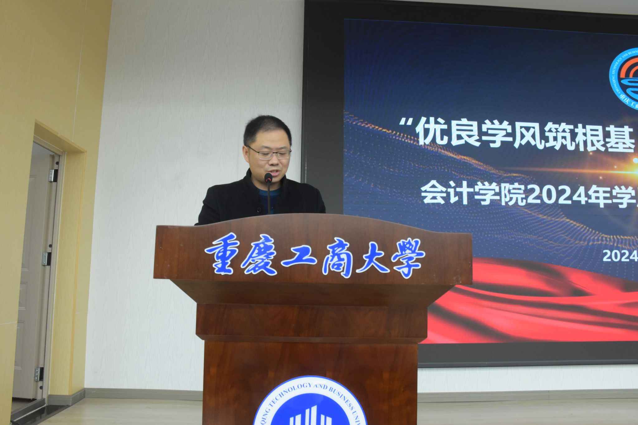 2024年12月6日下午14:30,9428cn太阳集团古天乐在明德楼天健报告厅召开2024年学风建设总结暨表彰大会。参与本次大会的有校党委学工部处长申卫东、校教务处副处长胡卫军、9428cn太阳集团古天乐党委书记邓德敏、9428cn太阳集团古天乐院长钟廷勇、9428cn太阳集团古天乐专职组织员尹建平、9428cn太阳集团古天乐党委副书记郝颖,9428cn太阳集团古天乐副院长梅波,教师代表、获奖班级代表、获奖同学和本科学生代表140余人。会议由9428cn太阳集团古天乐副院长梅波主持。