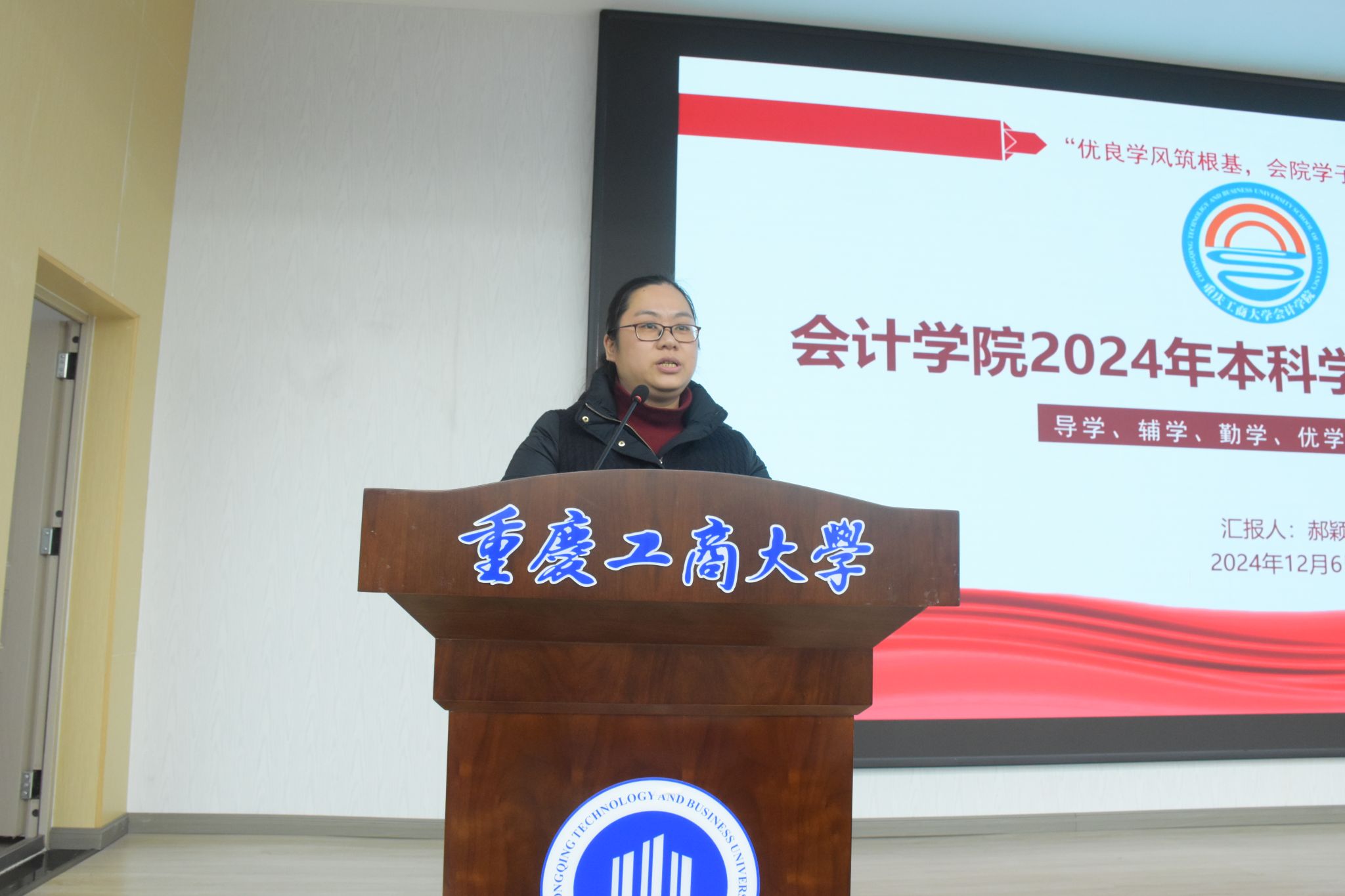 大会伊始,郝颖副书记对学院2024年学风建设工作做总结,她指出:学院秉承“勤学善思、求真笃行”的学风和“诚信精业、含弘自强”的院训,结合专业特点和学生实际,持续优化“导学、辅学、勤学、优学、督学、励学”六位一体学风建设体系,着力培养学院优良学风,形成了以活动促学风、以服务护学风、以榜样树学风、以实践创学风、以管理强学风、以环境育学风的学风建设工作新格局,全力培养德智体美劳全面发展的卓越创新会计人才。同时,她还从创设“导学—引领”体系、搭建“辅学—帮扶”体系、培育“勤学—示范”体系、打造“优学—实践”体系、构建“督学—养成”体系、布局“励学—激发”体系做了学院2024年学风建设的工作总结,并对学院未来学风建设工作做出展望。