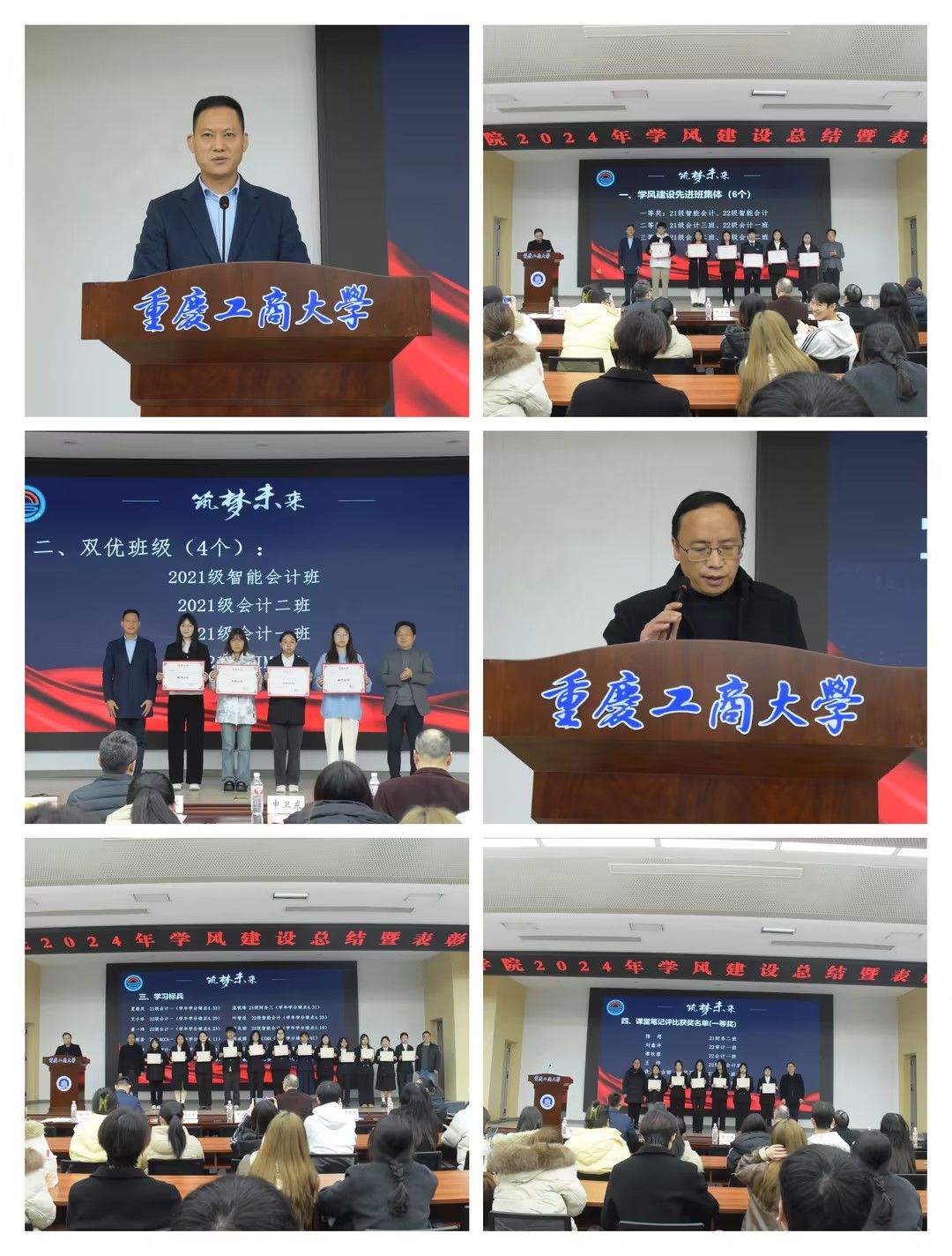 钟廷勇院长宣读《关于表彰2023-2024学年2021、2022级学风建设先进班级和双优班级的决定》,申卫东处长、钟廷勇院长为获奖班级颁奖。尹建平处长宣读《关于表彰9428cn太阳集团古天乐2023-2024学年2021级、2022级本科学习标兵的决定》,胡卫军副处长、尹建平处长为获得学习标兵的张婧等20位同学颁奖。梅波副院长宣读《关于表彰9428cn太阳集团古天乐2024年本科生优秀课堂笔记的决定》,郝颖副书记、梅波副院长为获得本科生课堂笔记评比奖项的同学颁奖。
