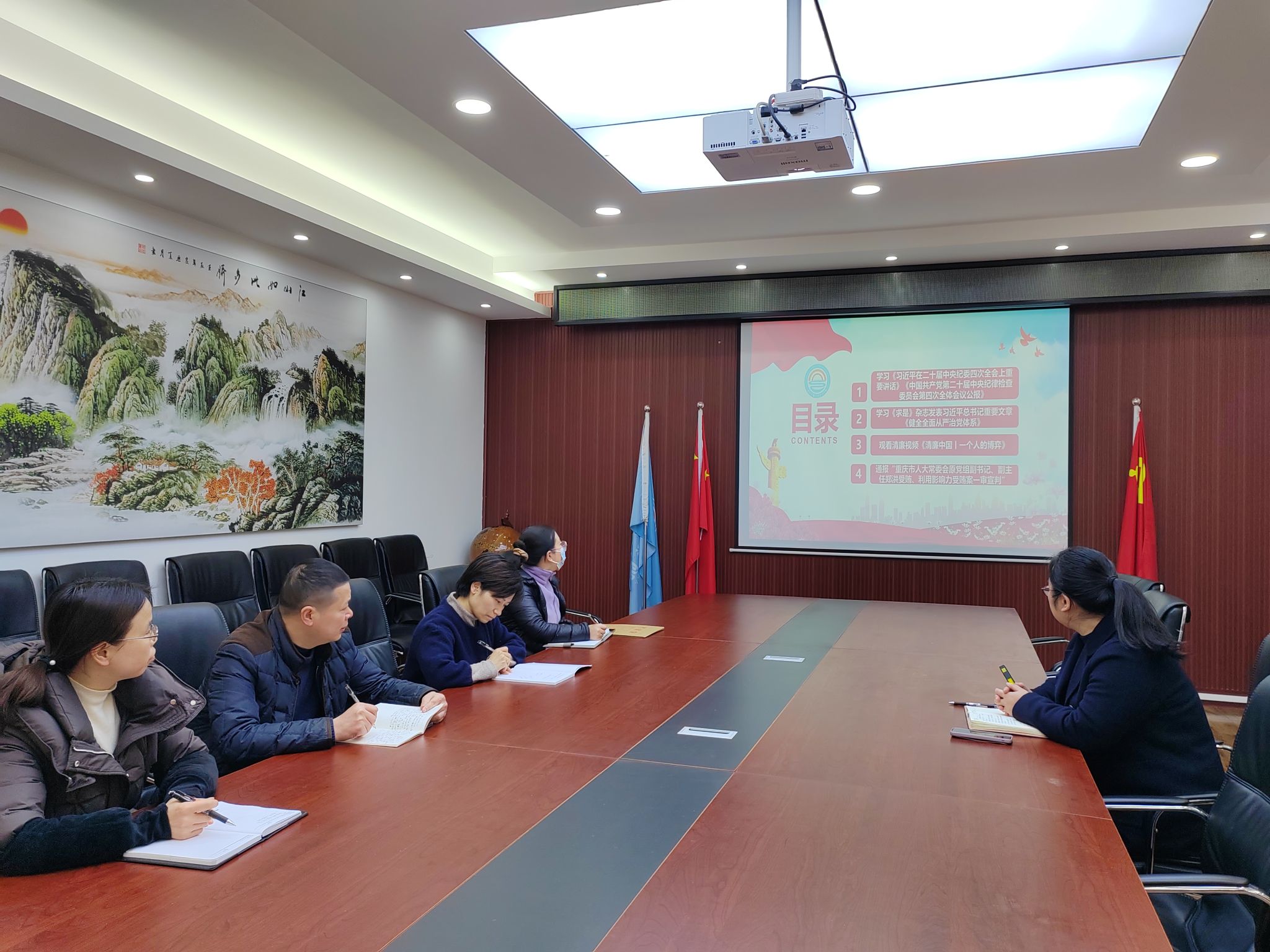 与会人员集中观看了清廉视频《清廉中国丨一个人的博弈》,学习讨论了“重庆市人大常委会原党组副书记、副主任郑洪受贿、利用影响力受贿案一审宣判”案例。