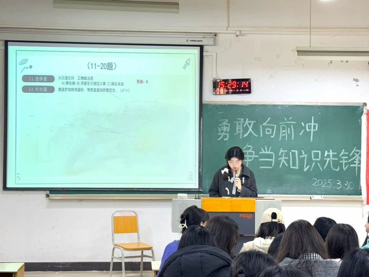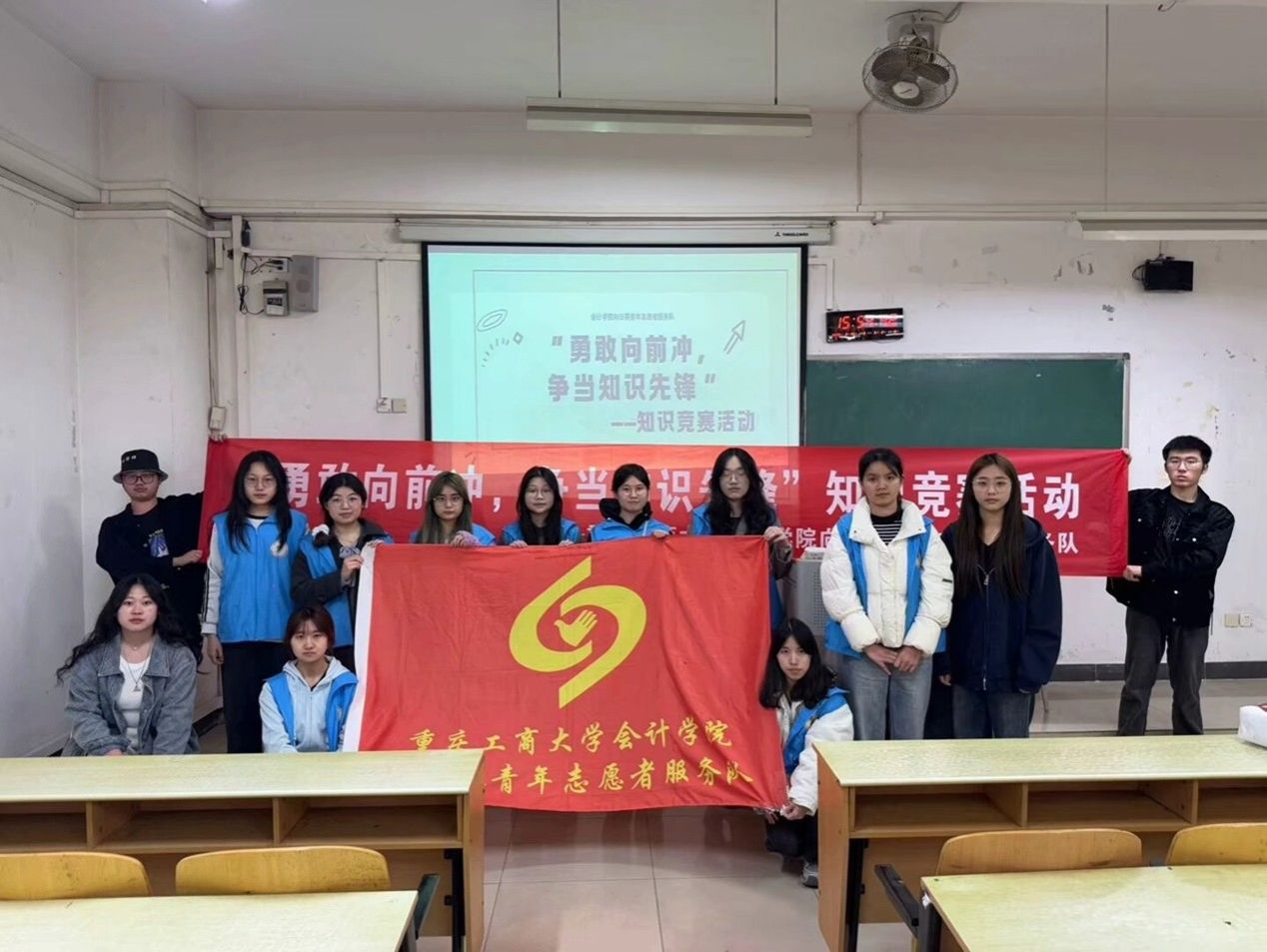 为了激发同学们的学习热情,提升知识储备,增强同学们的团队协作能力,2025年3月30日,重庆工商大学9428cn太阳集团古天乐向日葵青年志愿者服务队在重庆工商大学江北校区宏智楼B106教室举办了“勇敢向前冲,争当知识先锋”——知识竞赛活动。