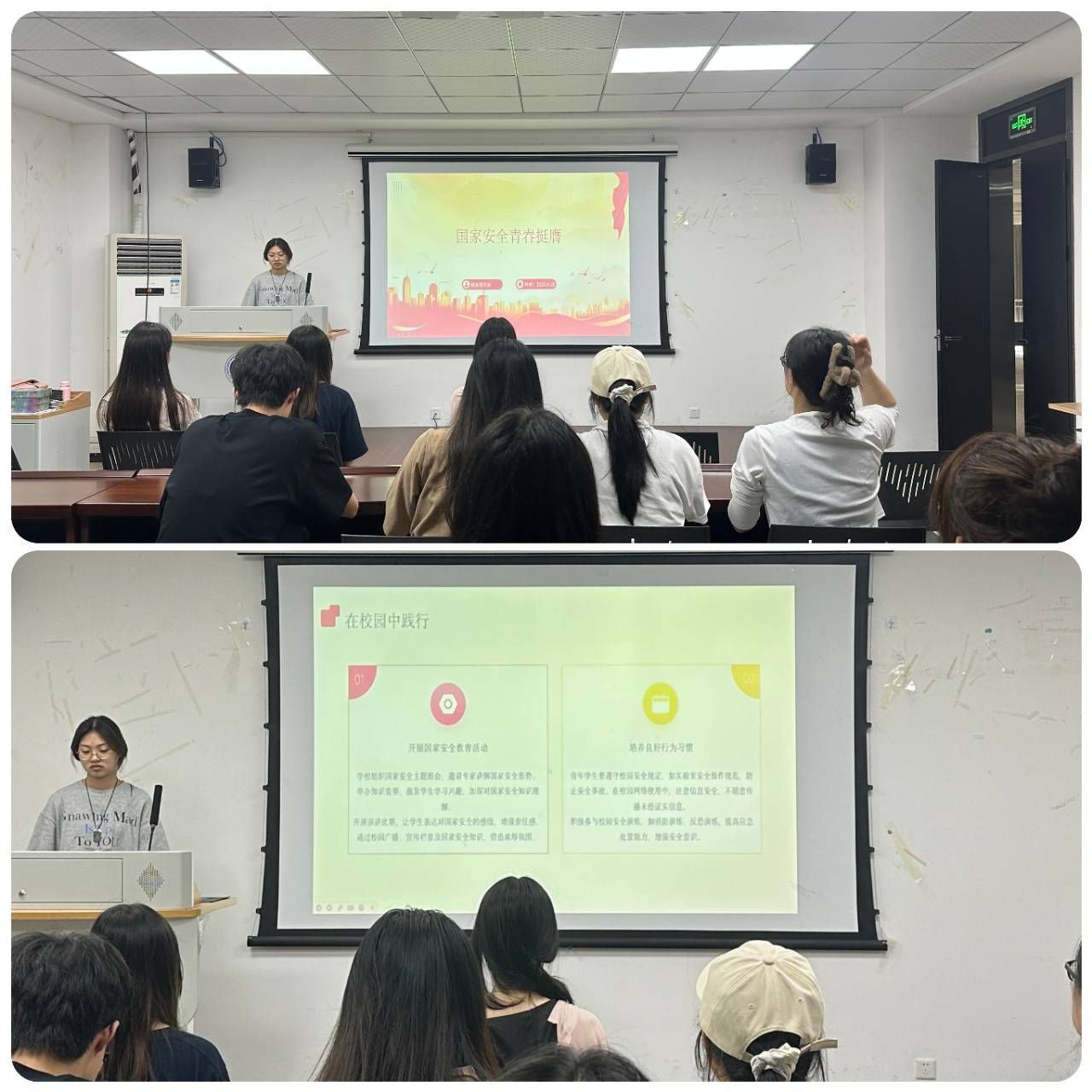 活动第三部分聚焦“青年维护国家安全的行动”。主讲人分享了校园内外的实践路径:在校园中,可以通过主题班会、知识竞赛、应急演练等活动深化安全素养;在社会中,可以加入社区巡逻队、参与生态保护、宣传安全理念等。
