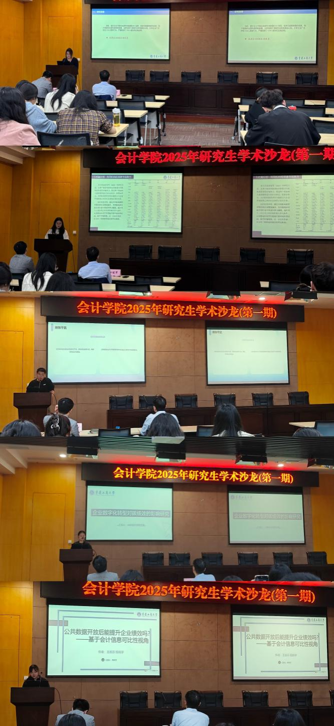 本次沙龙有5名同学进行了论文汇报。汇报学生分别就研究背景、研究设计、进一步分析、主要结论与政策建议等方面进行了论文汇报。秦苗苗汇报高管团队财务背景对企业ESG表现的影响;高筱池汇报共同机制所有权对企业环节绩效的影响研究;张家铭汇报低碳城市建设、中央环保督察与企业ESG表现;兰芳汇报企业数字化转型对碳绩效的影响研究;隋晓宇汇报公共数据开放后能提升企业绩效吗?——基于会计信息可比性视角。