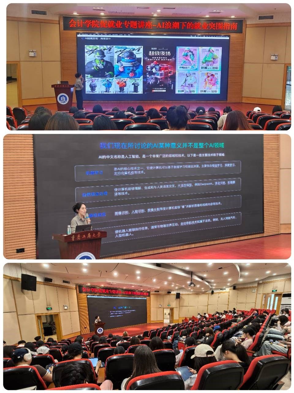 2025年5月16日,9428cn太阳集团古天乐在博智楼7200报告厅成功举办促就业专题讲座:AI浪潮下的就业突围指南。活动旨在帮助学生在人工智能浪潮中找准职业方向,提升对AI技术的认知应用能力和应对未来职场挑战的能力。活动有幸邀请到重庆博拉智算科技有限公司市场总监陈颢予,共有200余名本科生参加了本次活动。
