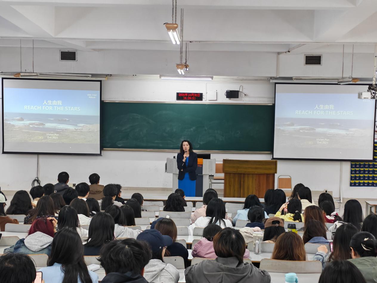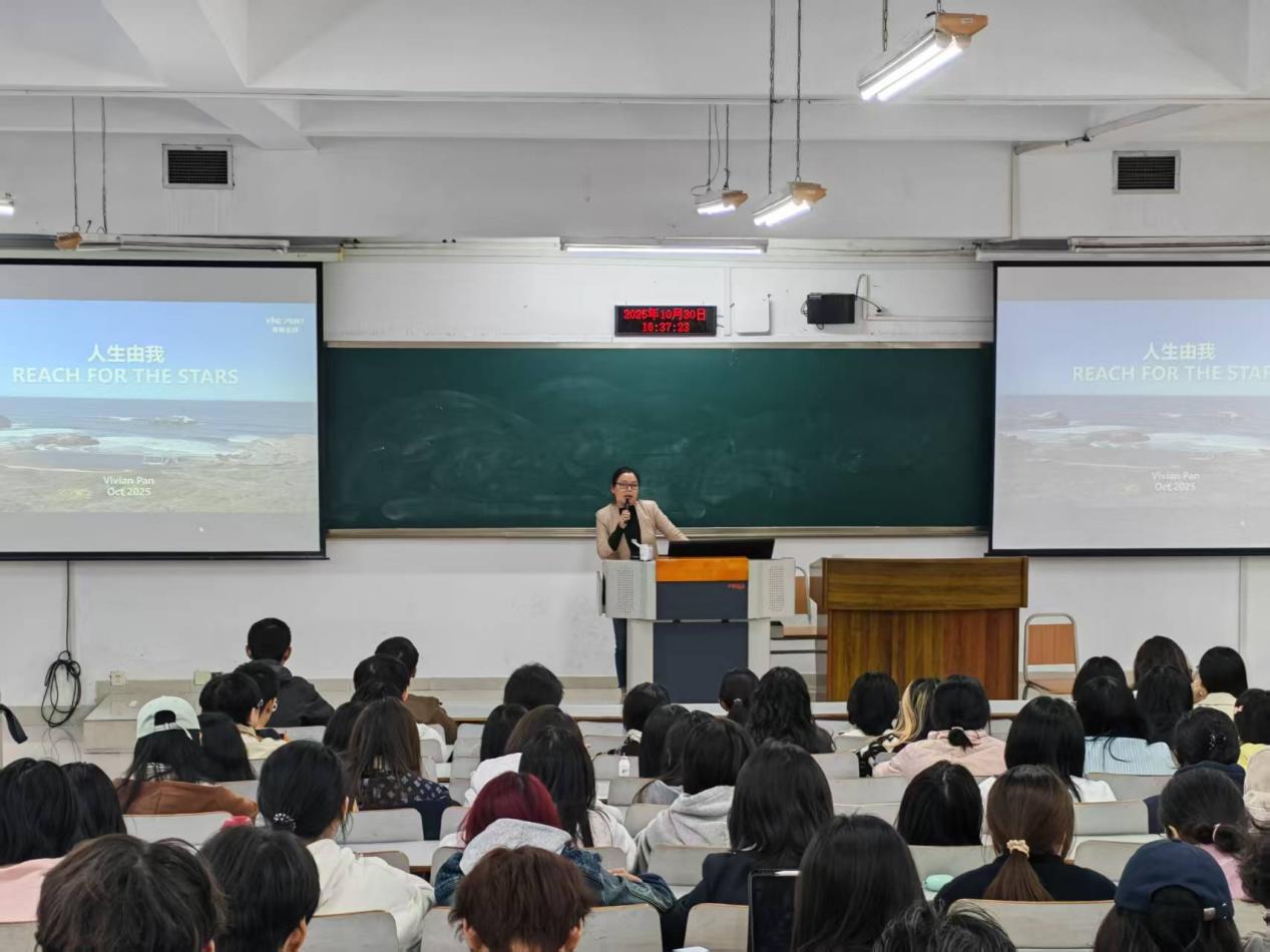此后,潘老师围绕职业发展路径展开深度分享。她强调,在AI技术飞速发展的当下,青年群体需积极拥抱AI浪潮,将其作为个人决策的重要工具,结合PEST等宏观分析模型赋能个人职业选择,同时明确“英语能力是基础,小语种可成为出海竞争优势”的语言能力培养方向。关于职业核心竞争力的构建,潘老师提出“把自己当成产品打造”的核心观点。她指出,规划应“以终为始”,聚焦个人热爱与擅长的领域,而非一味弥补短板,通过竞赛、项目积累实践经验,并从大一开始规划至少三段高质量实习,尽早实现个人“产品化”。针对未来就业趋势,她结合2030年职业与技能发展预测,提醒听众需瞄准增长最快的技能领域,以终身学习的态度持续迭代自身能力,鼓励大家主动“走出去”体验,明确“希望成为谁”的目标,向产品经理等具备综合能力的职业方向对标,为未来职业发展夯实基础。同时,潘老师也分享到双选会是就业的重要契机,观察公司简历情况是了解未来就业趋势和岗位所需能力的重要途径。潘老师强调审计、税务、咨询等岗位,都有很大的发展空间。在打造个人能力方面,潘老师强调领导力是一种综合能力,她提醒同学们不仅要学会自我驱动,还要学会驱动他人。在职业发展中,永远不要限制自己,要勇敢地走出去体验不同的工作和生活。