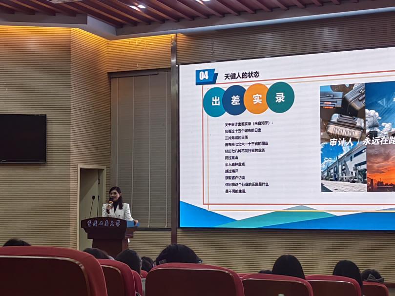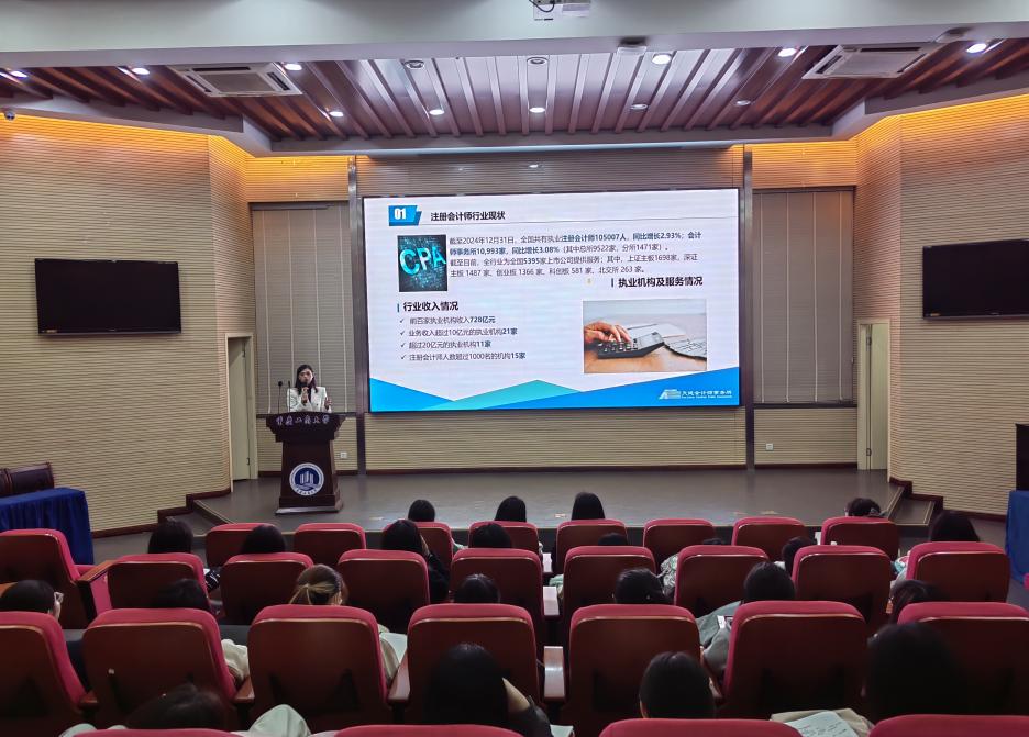 许静以“未来已来,未来可期”为主题展开讲座。她以亲切的提问拉近与同学们的距离,了解大家的大学生活适应情况,并强调提前进行职业生涯规划的重要性。她引用“天行健,君子以自强不息”激励同学们奋发向上,随后深入解读了注册会计师行业的现状与发展趋势。