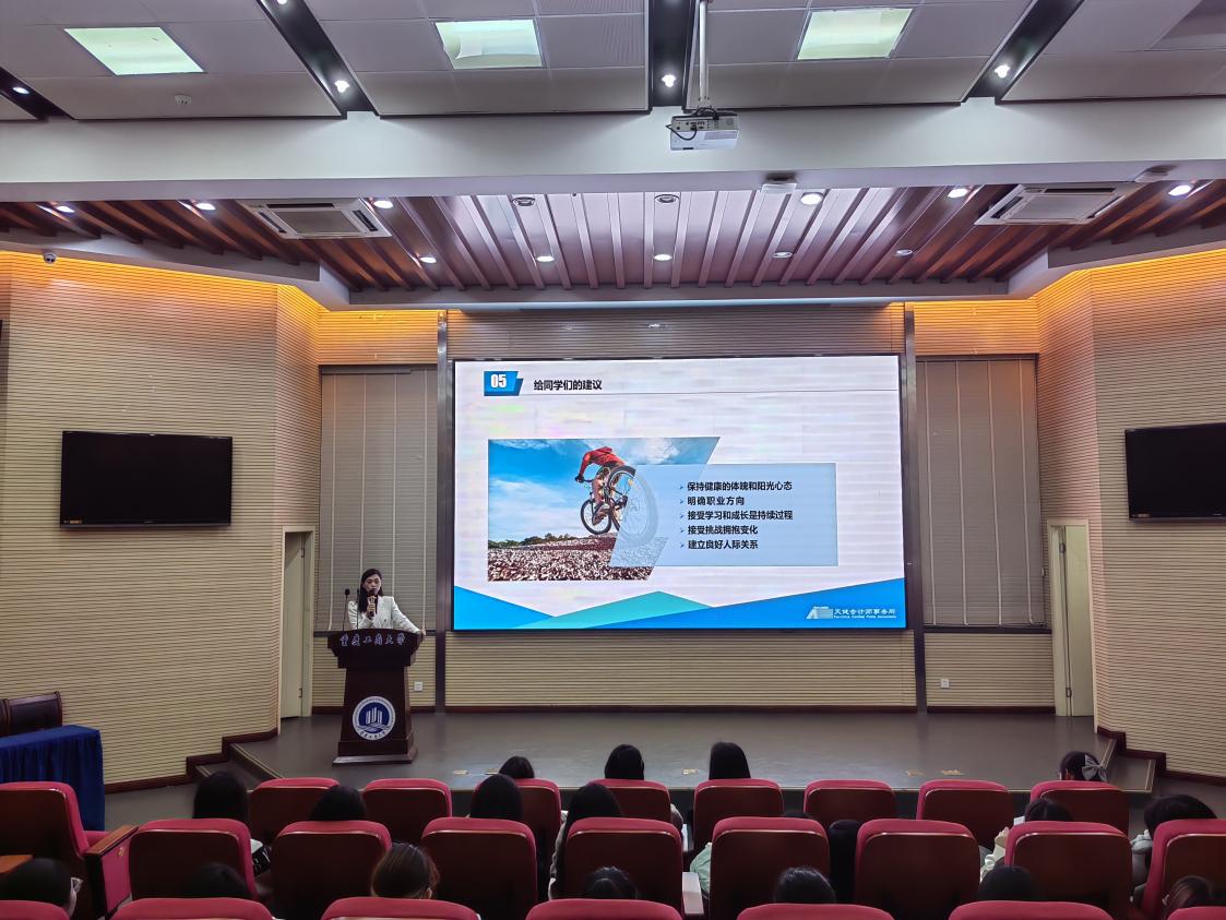 在讲座尾声,许静向同学们提出几点建议:保持健康的体魄和阳光的心态,明确职业方向,树立终身学习的意识,勇于接受挑战,积极拥抱变化,并建立良好的人际关系与沟通能力。