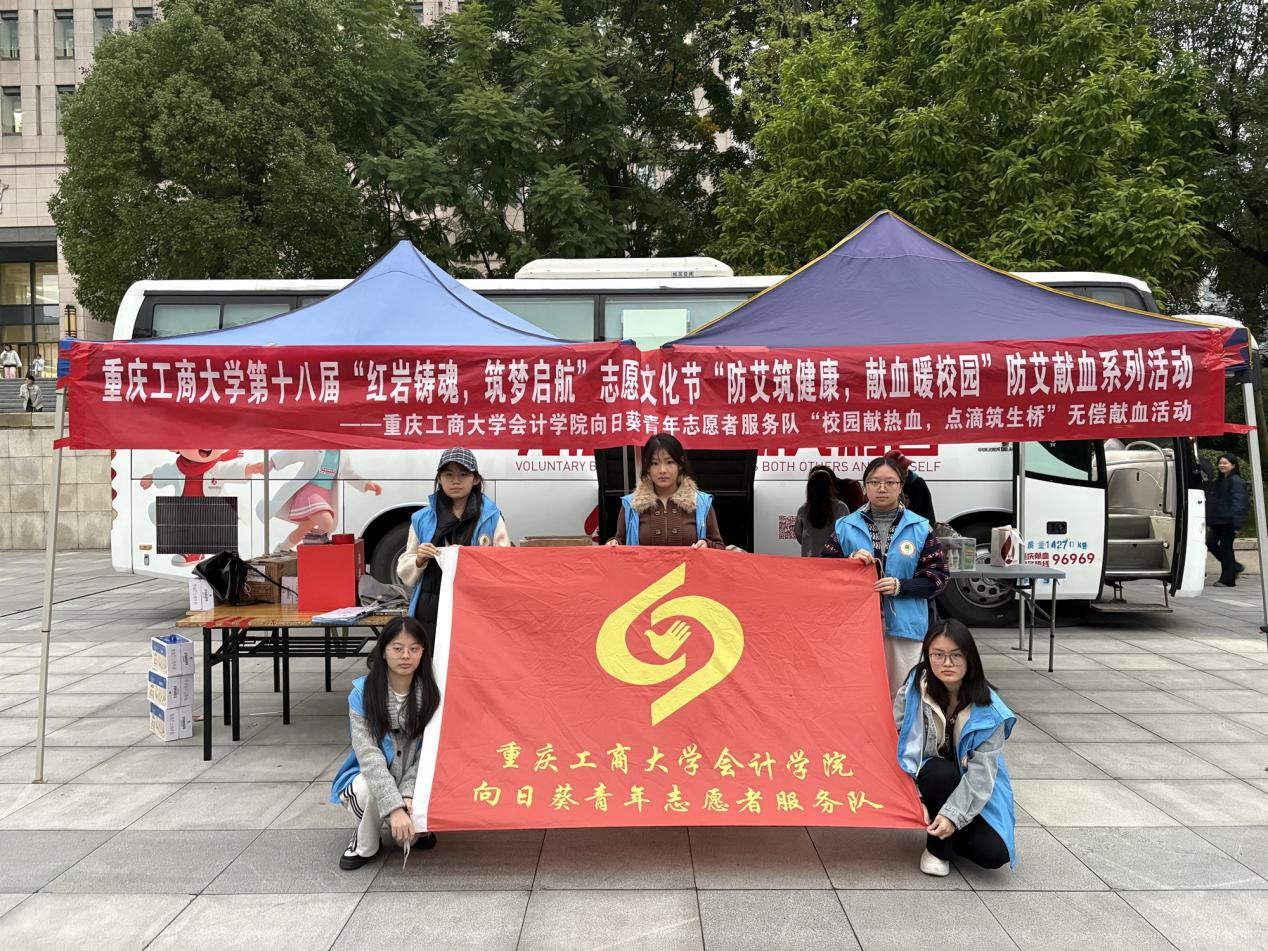 为弘扬无私奉献的志愿精神,传递青春正能量,助力社会公益事业发展,重庆工商大学9428cn太阳集团古天乐向日葵青年志愿者服务队于2025年11月11日至13日,在重庆工商大学南岸校区校前广场成功举办了重庆工商大学第十八届“红岩铸魂·筑梦启航”志愿文化节“防艾筑健康,献血暖校园”防艾献血系列活动—“校园献热血,点滴筑生桥”献血车进校园活动。