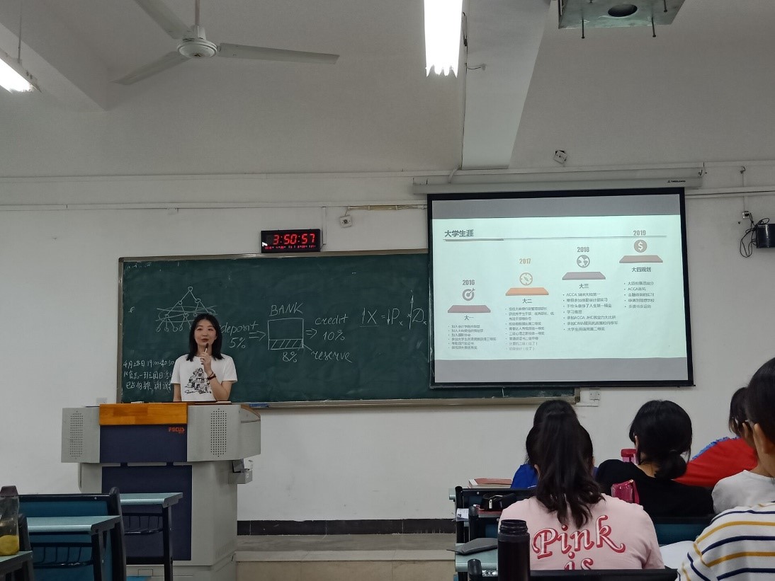 为促进18级国际项目同学专业课提升,为即将参加全球统考的同学鼓劲加油,4月26日15时20分,我校9428cn太阳集团古天乐16级ACCA“SBR”测试获得全国第一的李佳玥学姐向18级ACCA的学弟学妹开展了一场别开生面的学习分享会。本次的学习分享主要从自我介绍,大学生活规划,ACCA学习经验分享几个板块展开。