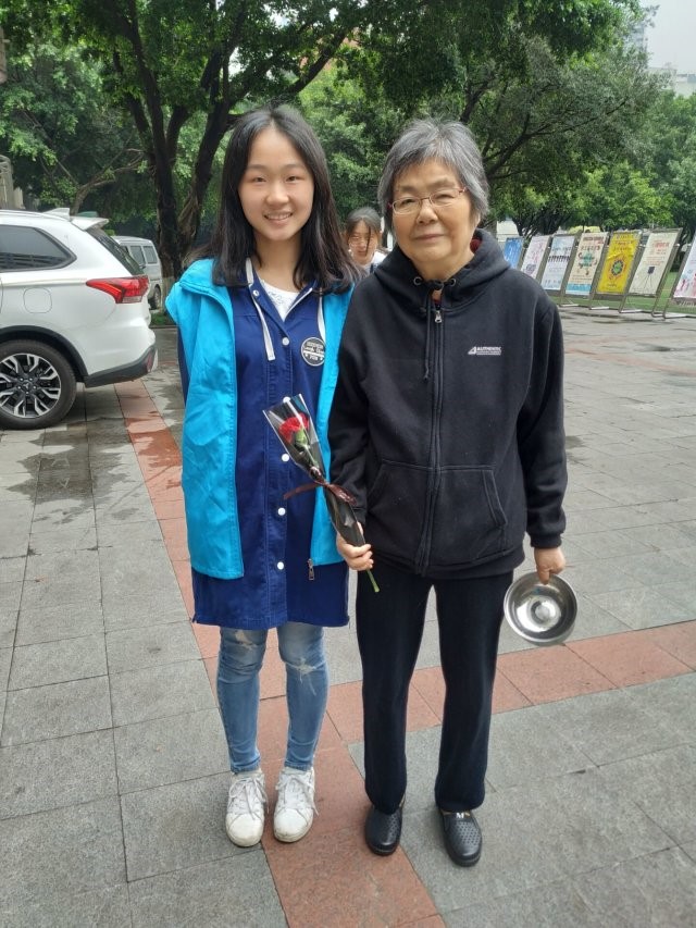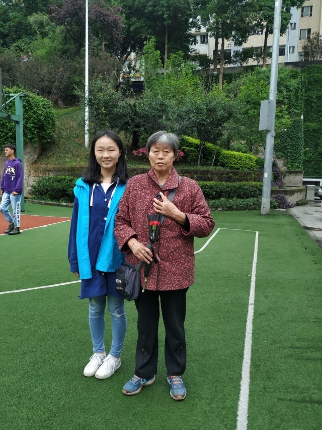 <奶奶拿着康乃馨看同学们写的三行情书>