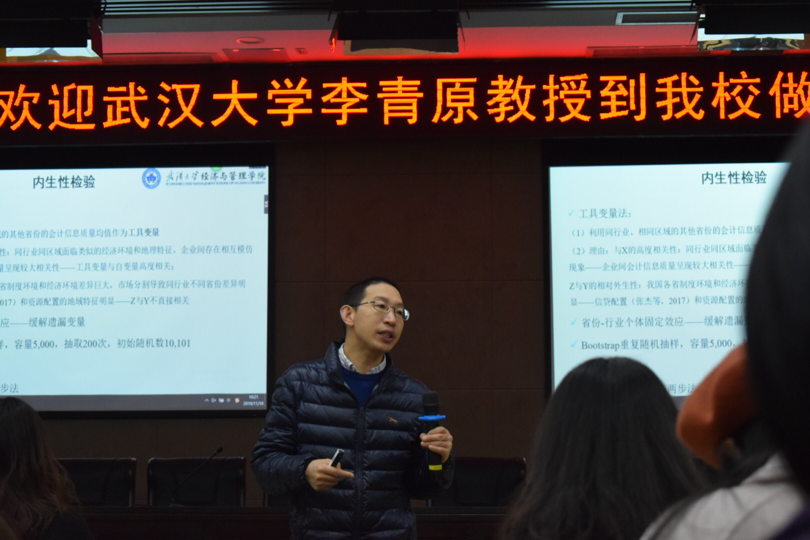 2019年11月18日上午,由重庆工商大学科研处、9428cn太阳集团古天乐主办,MPAcc教育中心承办的第二十四期会计名家大讲堂在图书馆多功能会议厅举行,来自武汉大学的青年长江学者李青原教授应邀为师生们做了题为“会计信息质量、资源配置与经济增长”的学术讲座。本次讲座由9428cn太阳集团古天乐副院长程文莉教授主持,9428cn太阳集团古天乐2019级全体研究生参加了此次讲座。